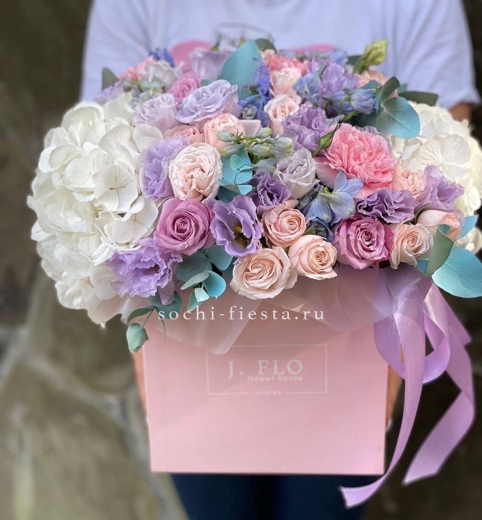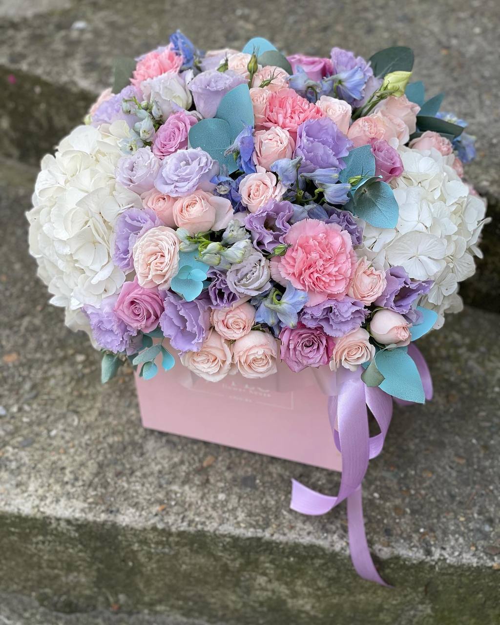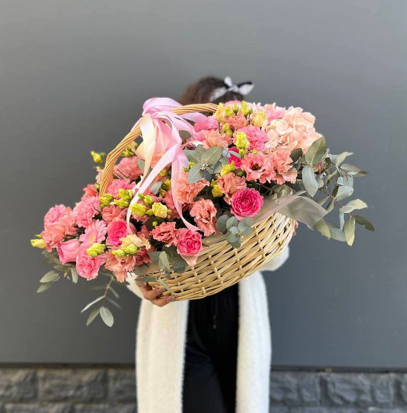 гортензия, диантус, розовая роза, эустома, гербера, корзина средняя, наполнение.