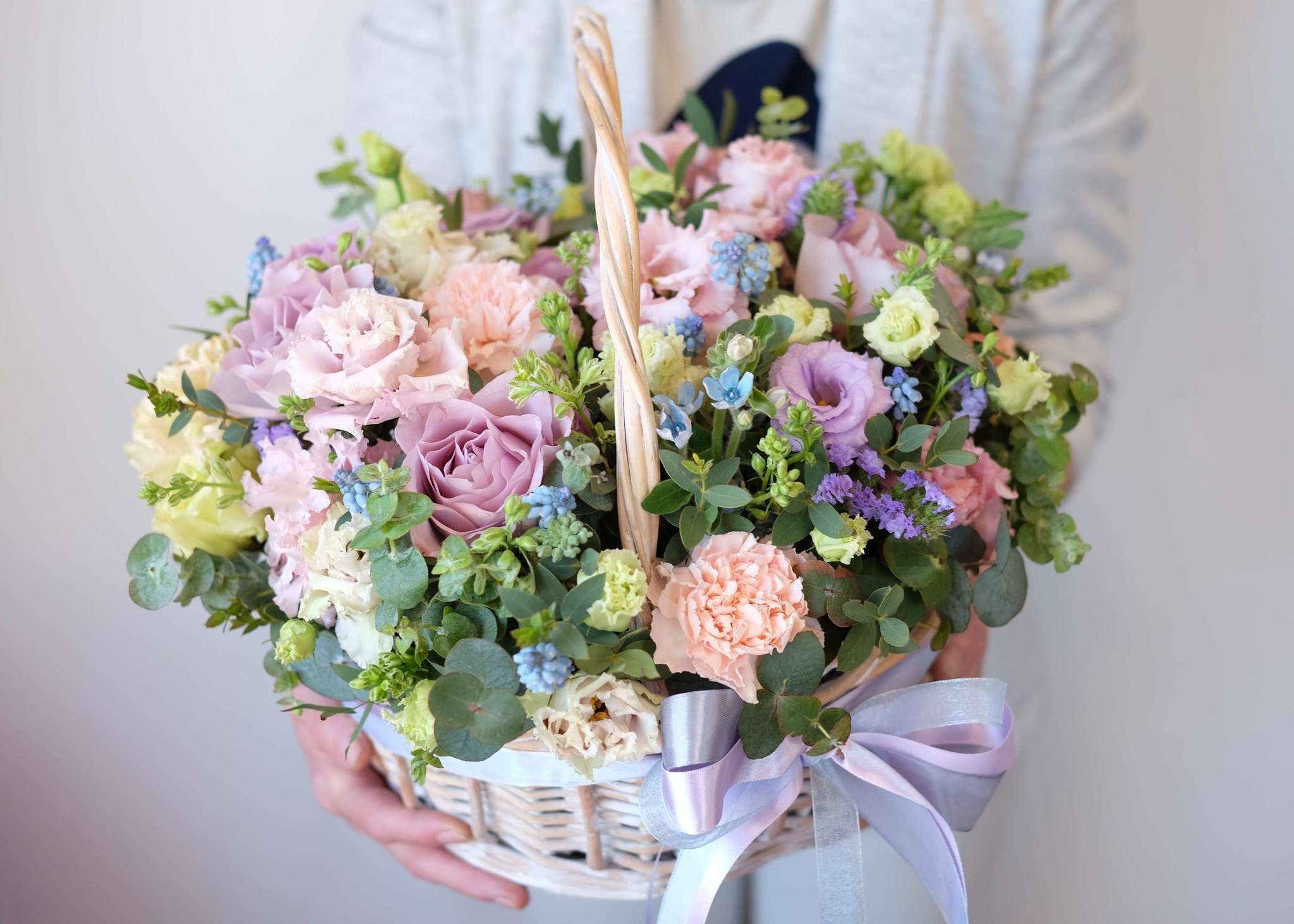 гортензии, лилии, хризантемы, пионы, лимониум, маттиола, корзина.