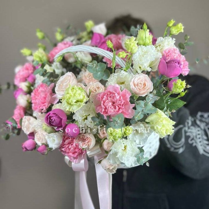 корпоративная цветочная корзина в нейтральной деловой гамме с фирменной лентой для поздравления партнёров садовая цветочная корзина с ранункулями эустомой и эвкалиптом в свободной аранжировке от флориста