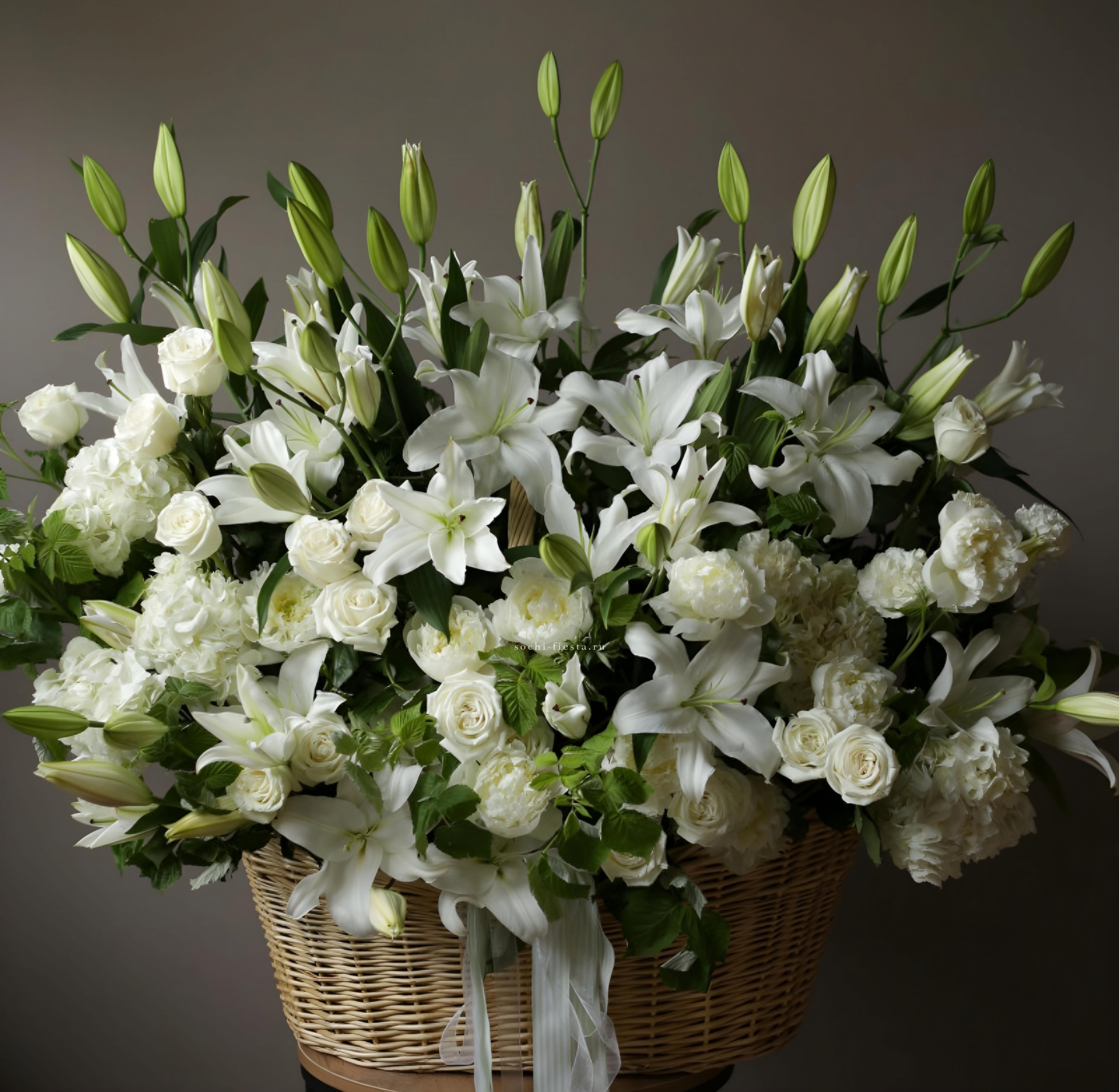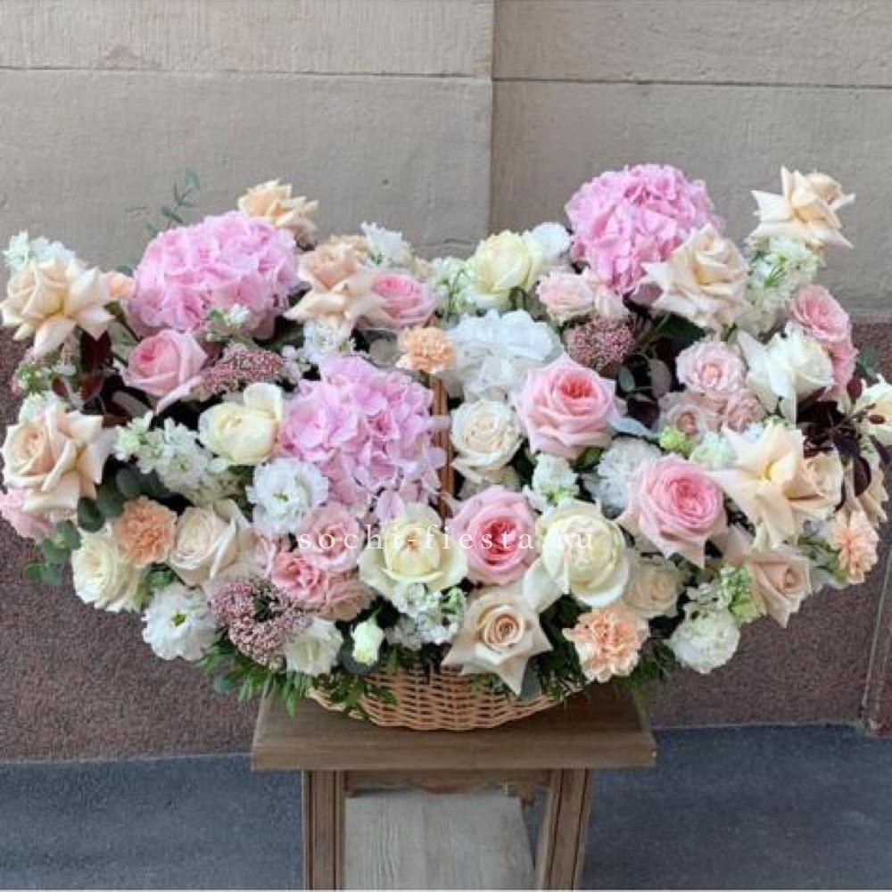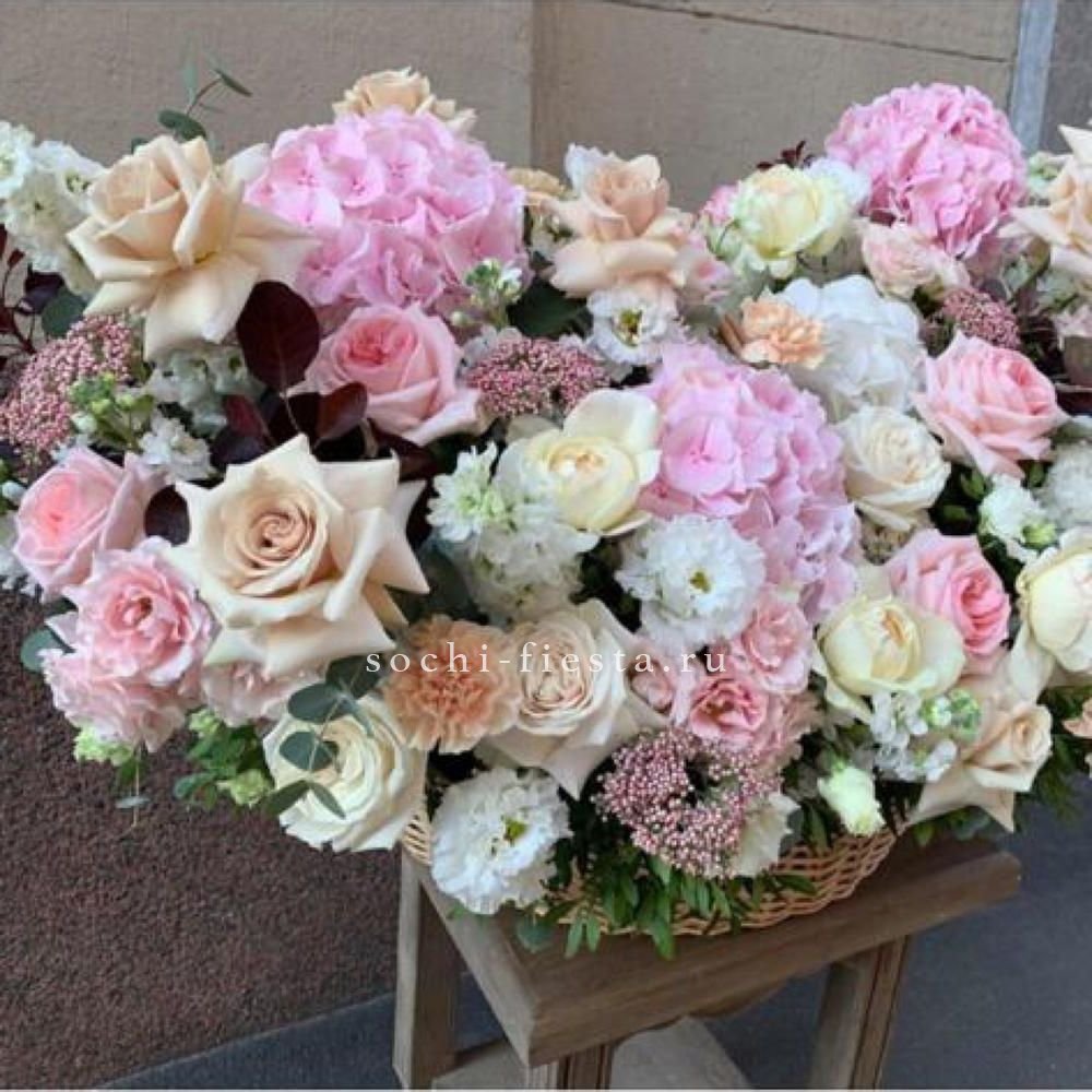 Широкая корзина вмещает пышную композицию из гортензий, эустом и пионовидных роз. Цветы располагаются свободно, создавая впечатление садовой клумбы, перенесенной в интерьер.