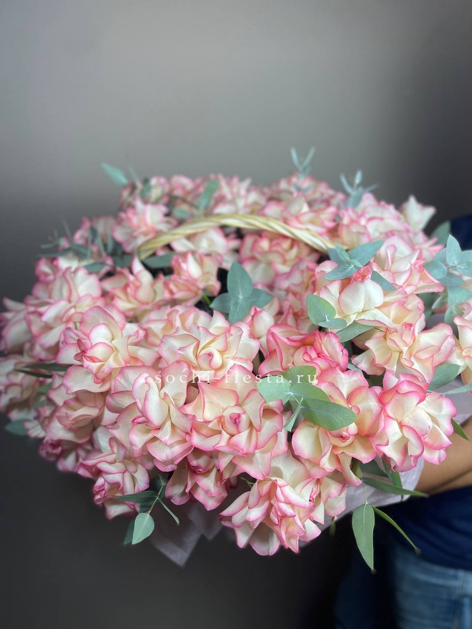 гортензия, эустома, пионовидная кустовая роза, розы одноголовые, диантусы, вспомогательная зелень, лента, корзина D45.