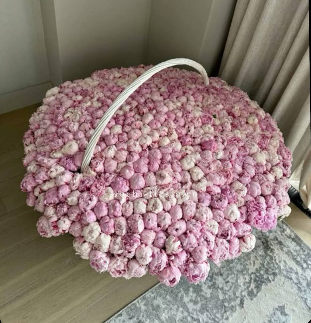 Пятьсот пятьдесят пять пионов Сара Бернар в одной корзине — это живая инсталляция из множества бутонов.