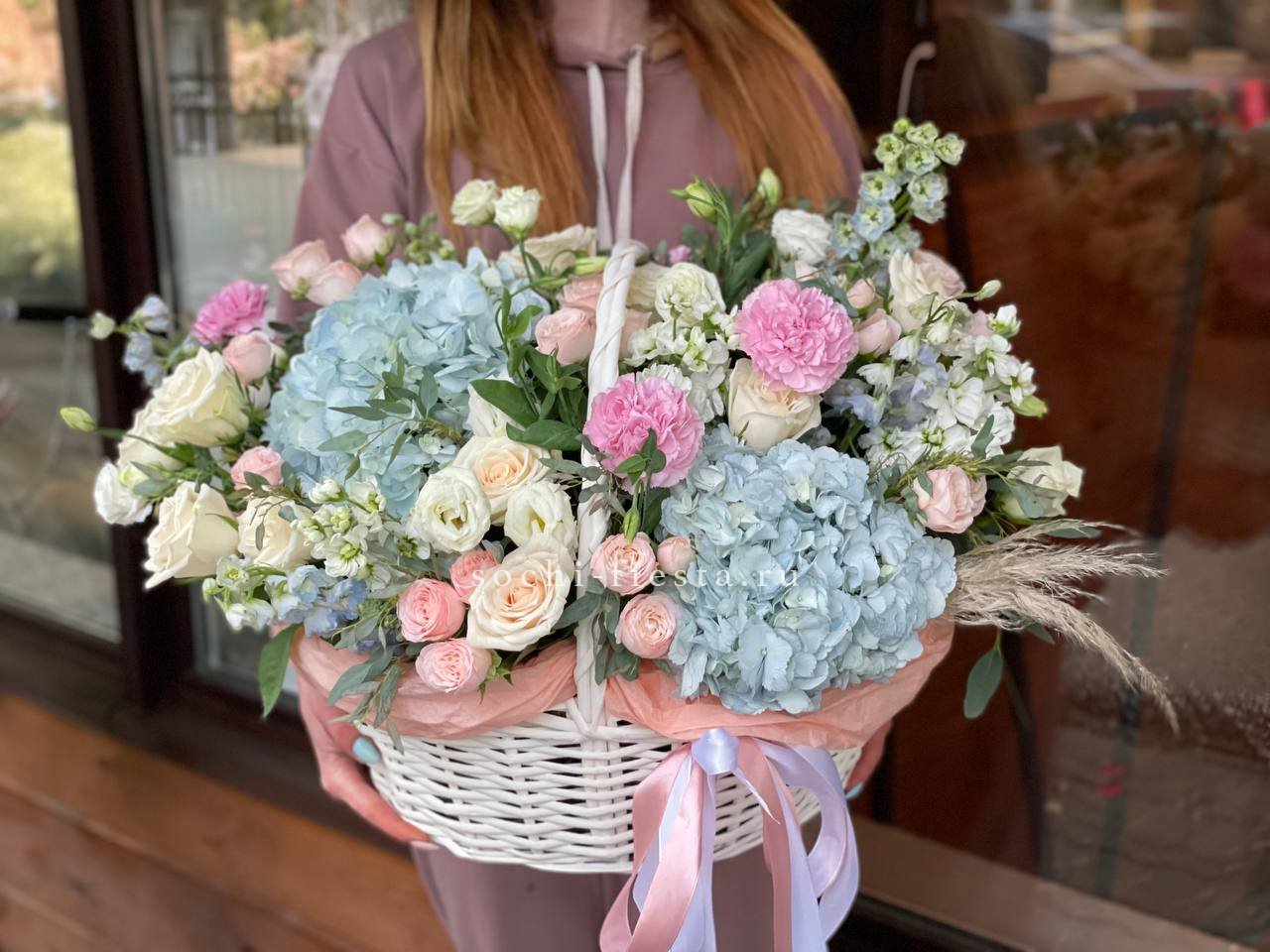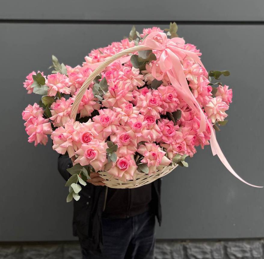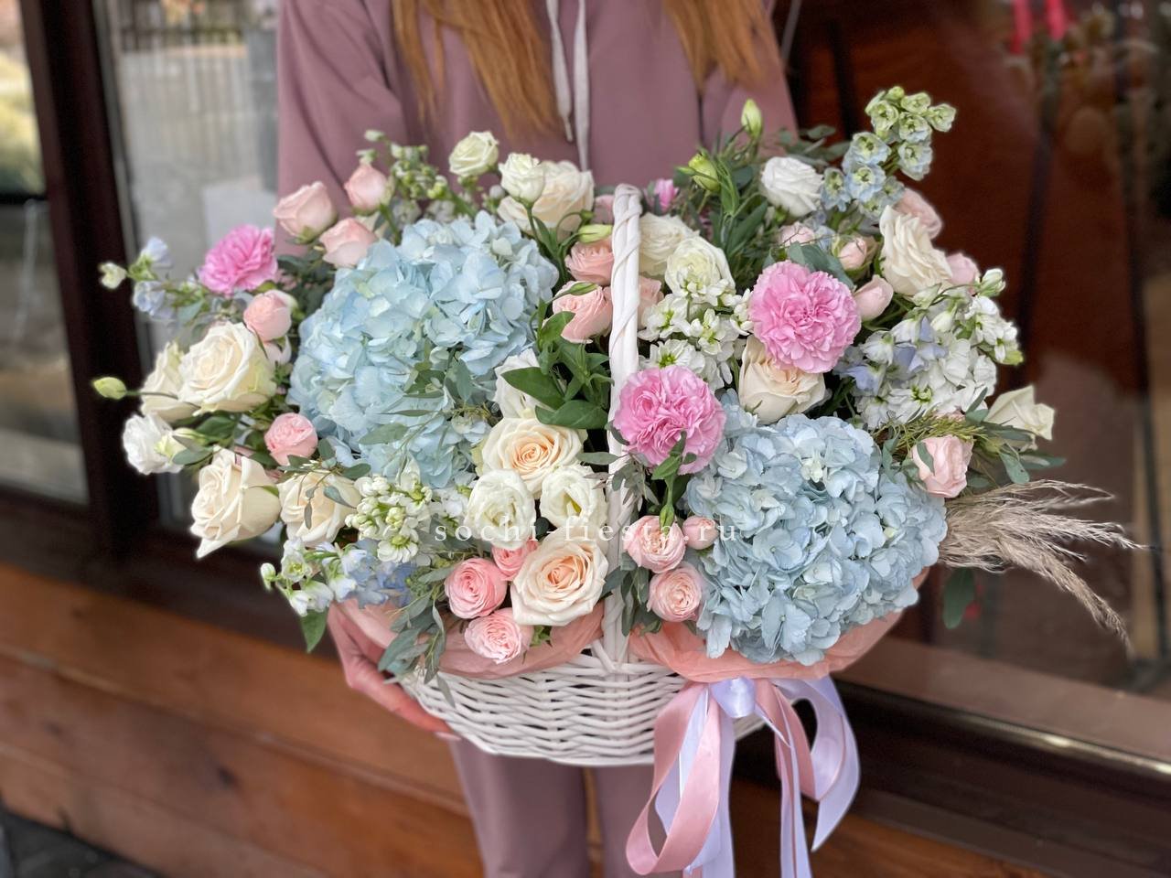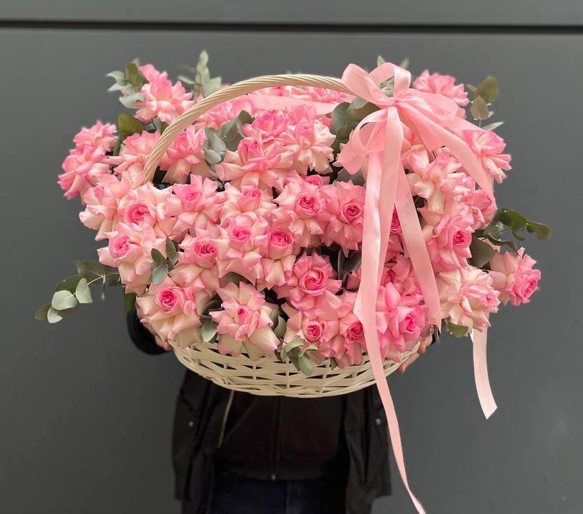Плетеная корзина вмещает густую композицию из лилий с добавлением эвкалипта. Объемная форма создает впечатление цветущего сада, собранного в одном месте.