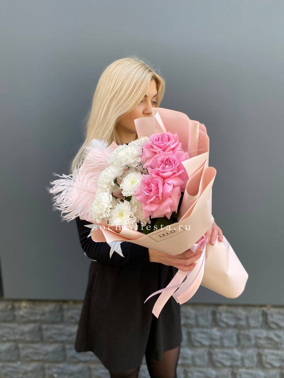 Компактная композиция с живым характером. Розовые розы и пушистая кустовая хризантема собраны плотно, а перо и ковыль придают букету лёгкую небрежность и естественный ритм.