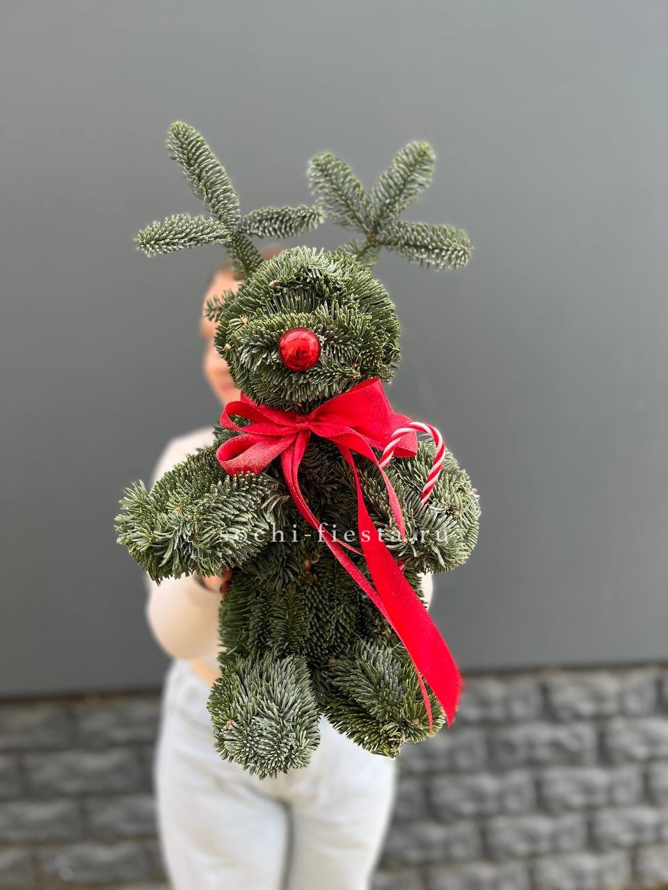 Фигура оленя полностью собрана из веток нобилиса. Объёмная скульптура с выразительным силуэтом заполняет пространство. Живая хвоя создаёт насыщенный зелёный фон для интерьера.