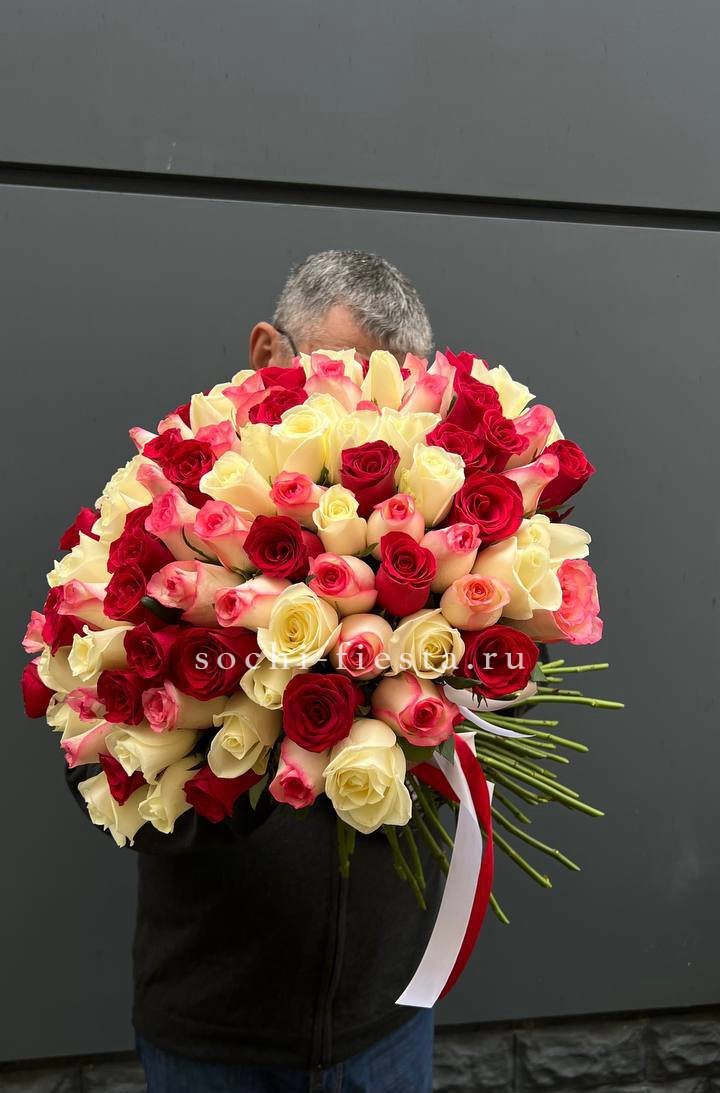 Мягкая игра оттенков между белым и розовым создает объемную глубину букета. Пятьдесят один бутон выстраивается в плотную структуру, где каждый цвет усиливает звучание соседнего без резких границ.