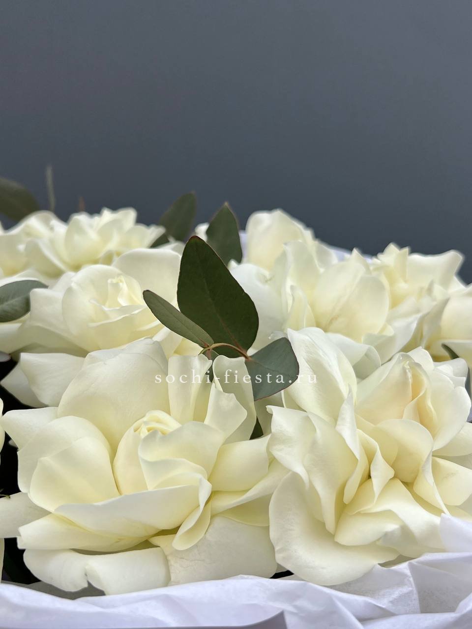 Плотная охапка кремовых роз с мягким переходом оттенков от сливочного до топленого молока. Бутоны собраны без зазоров, образуя округлую форму с естественным объемом. Атласная лента фиксирует стебли и завершает композицию.