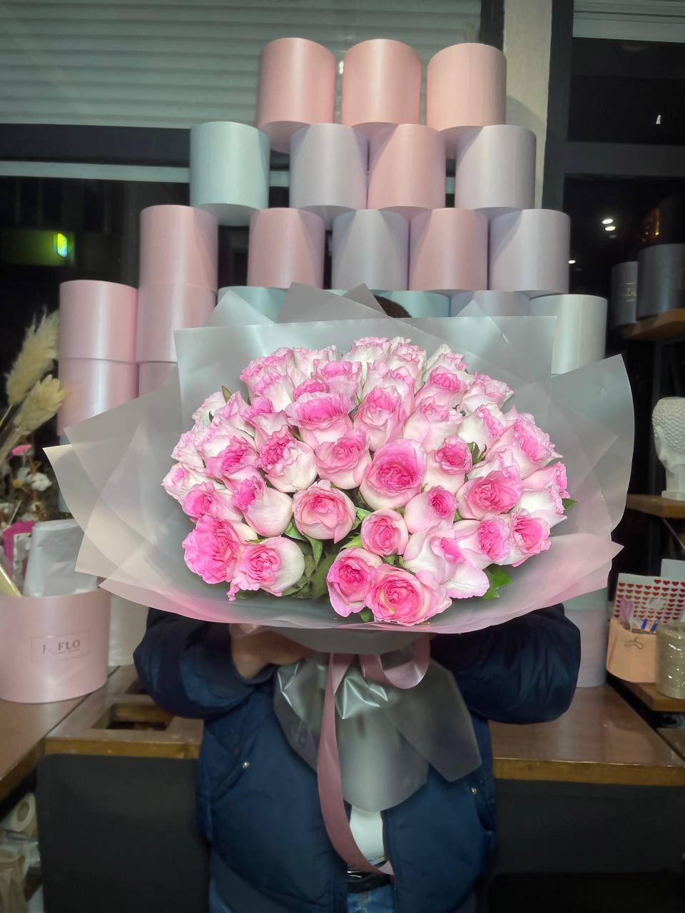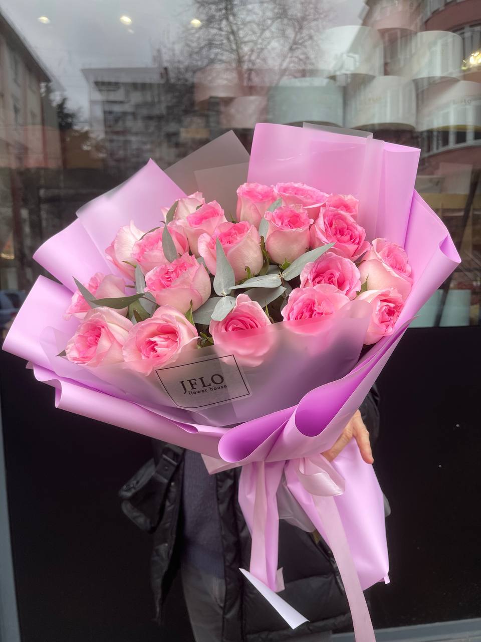 Девятнадцать бутонов раскрываются плавными волнами, создавая объёмную композицию с чёткими линиями. Розовый оттенок переходит от светлого к насыщенному, а эвкалипт добавляет воздушности между соцветиями. Букет держит форму и выглядит самодостаточно.