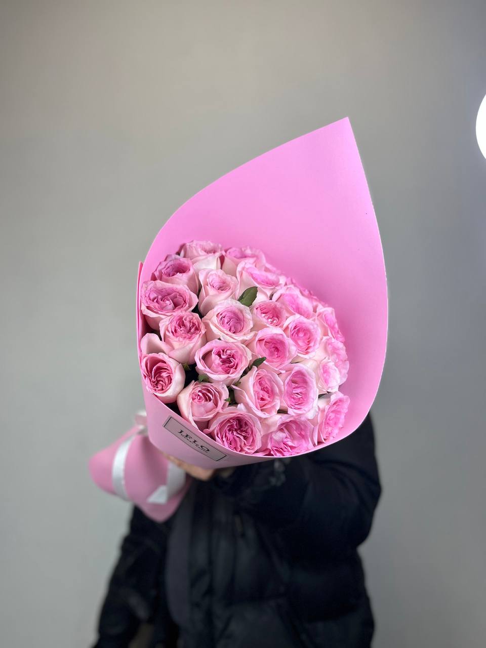 Девятнадцать роз в глубокой черной упаковке создают графичный силуэт с четким ритмом. Темный фон усиливает яркость розовых бутонов и добавляет композиции современное звучание.