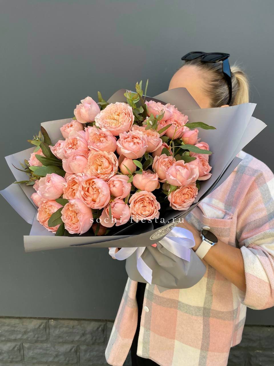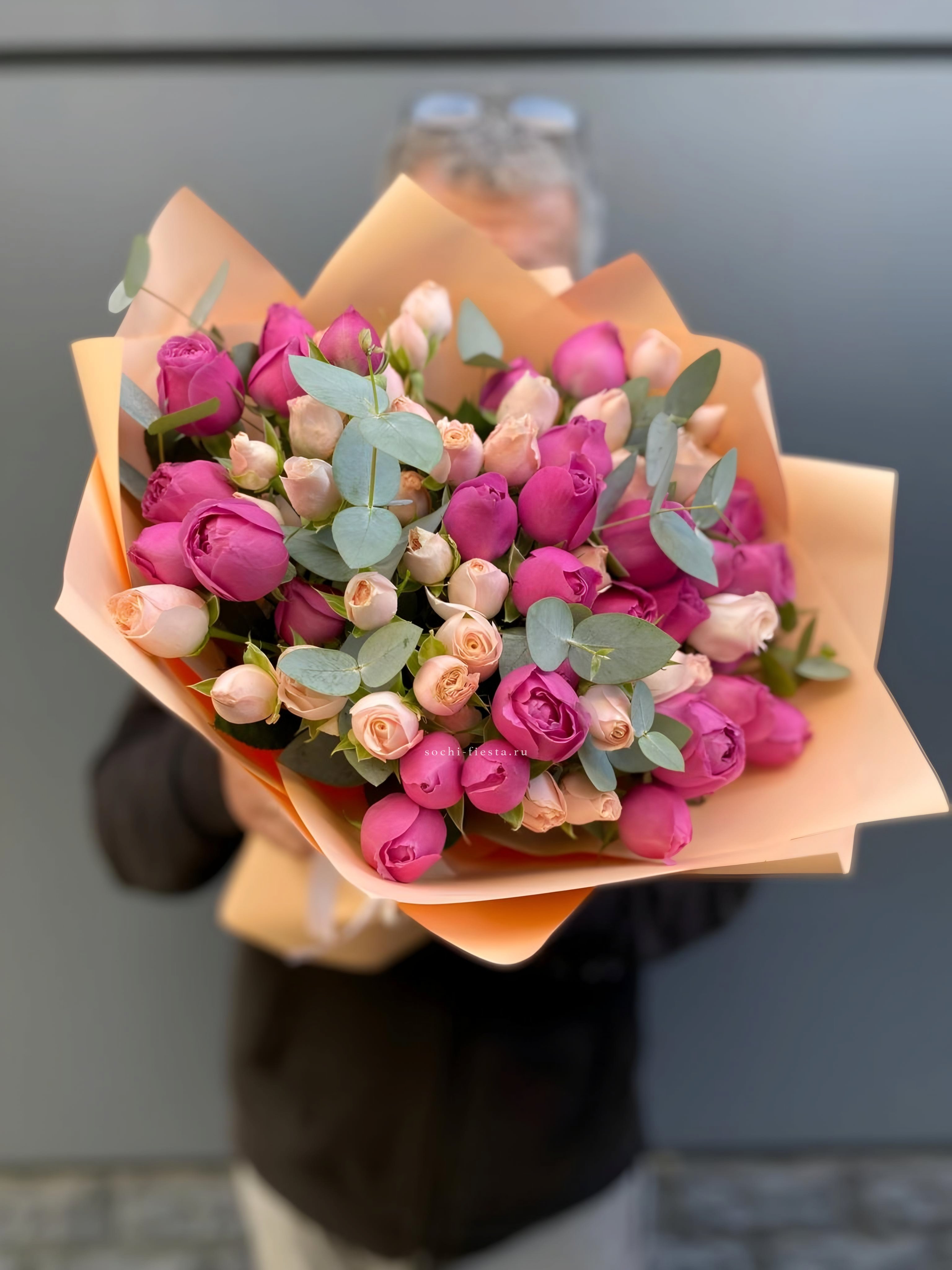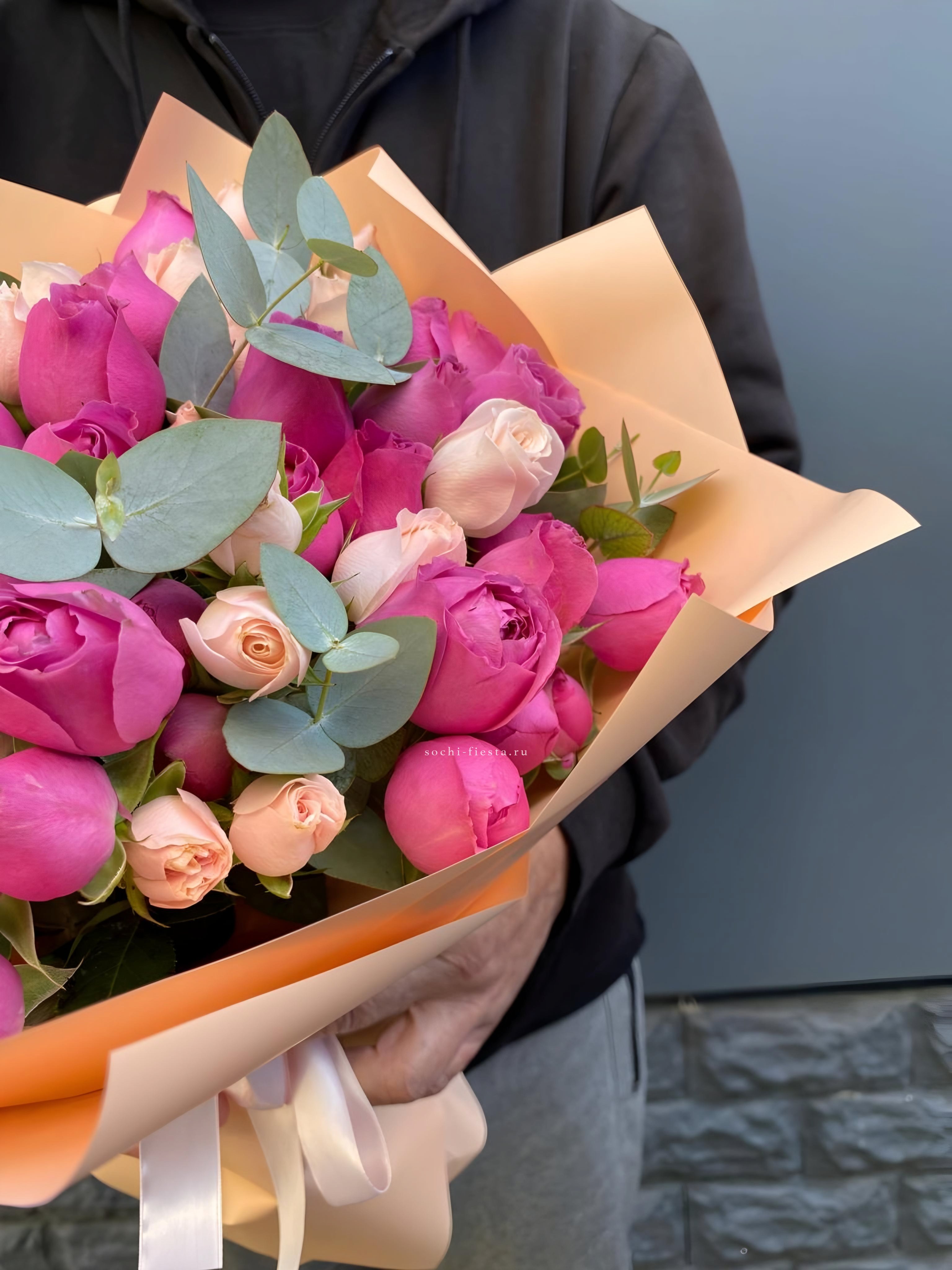 яркий букет из 11 пионовидных кустовых роз с эвкалиптом.