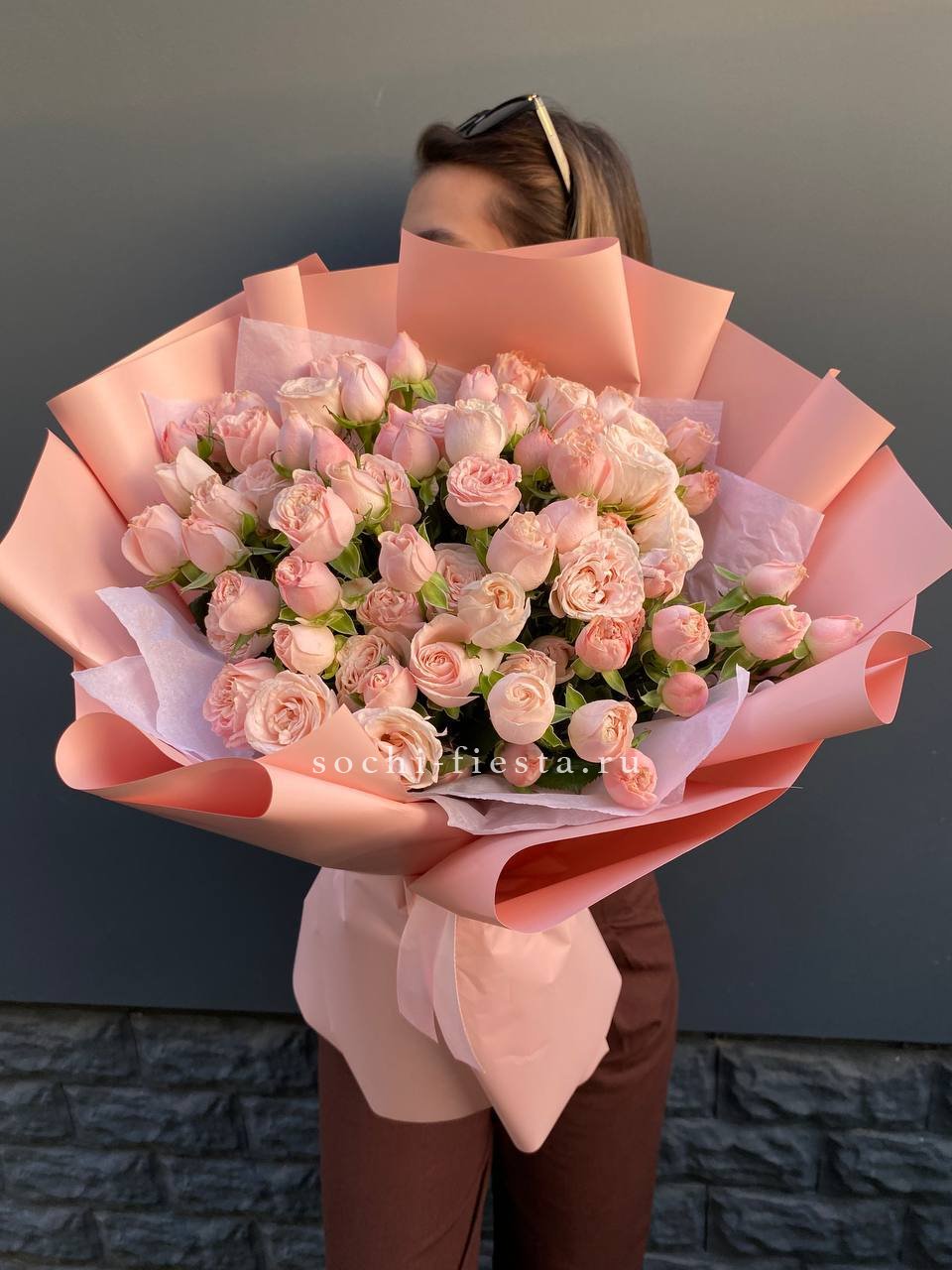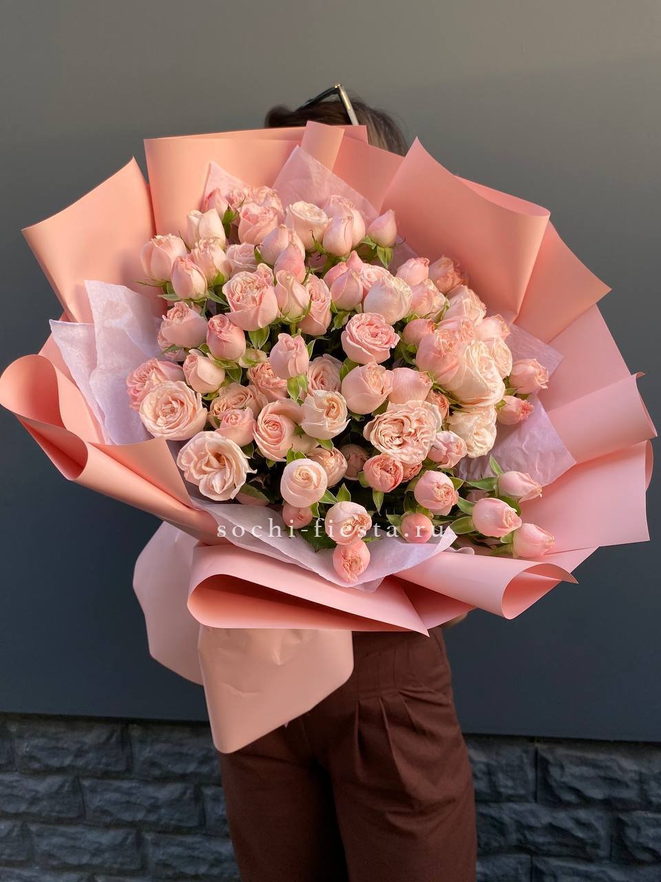 Двадцать пять кустовых роз Бомбастик собраны в пышную композицию с выраженной округлой формой. Плотные многолепестковые бутоны располагаются близко друг к другу, создавая насыщенный визуальный ритм и объемную структуру букета.