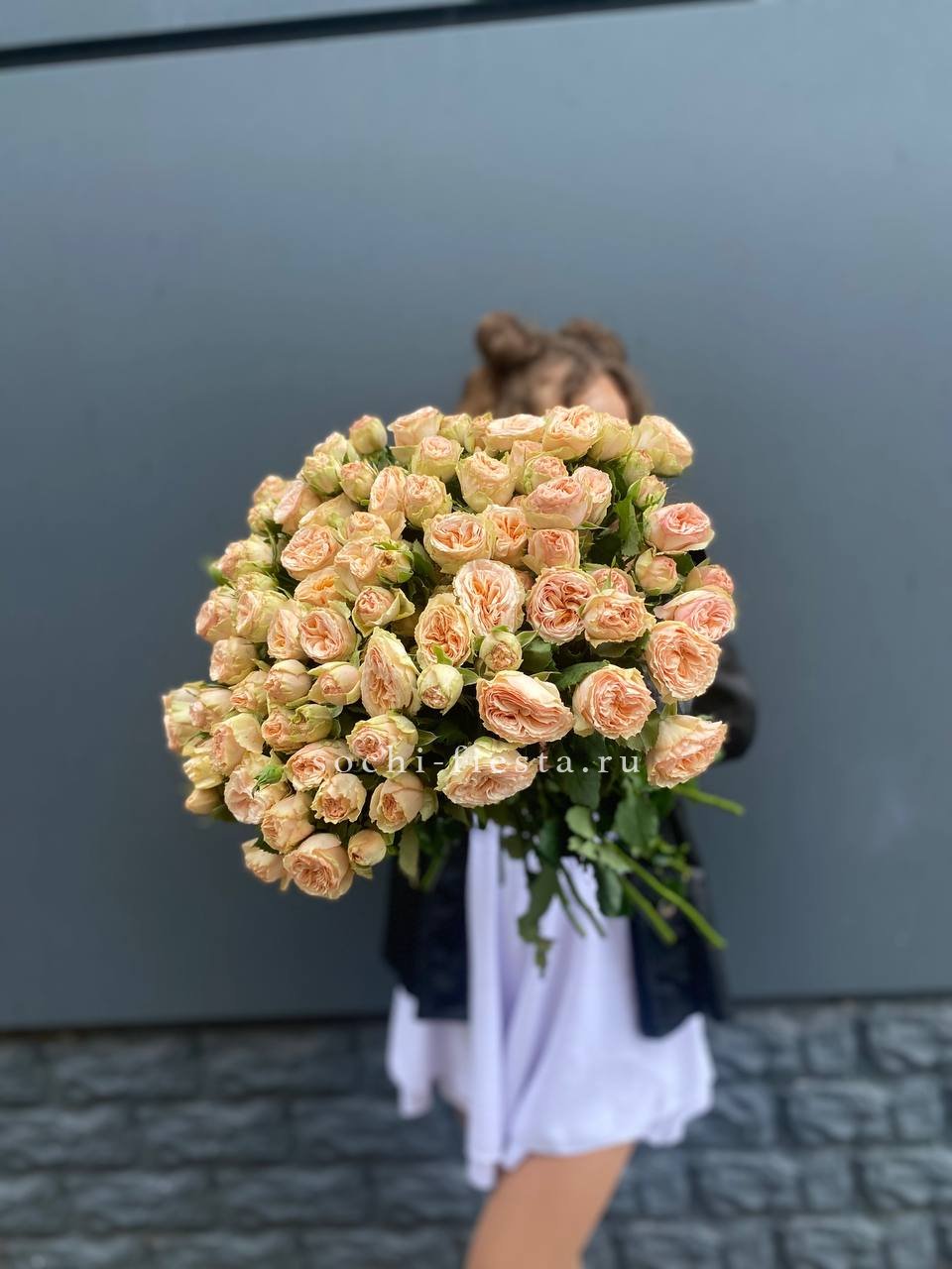 Двадцать пять пышных пионовидных роз собраны в плотный купол, где каждый бутон раскрывается слоями густых лепестков. Объёмная композиция заполняет пространство живой текстурой и создаёт ощущение abundance.
