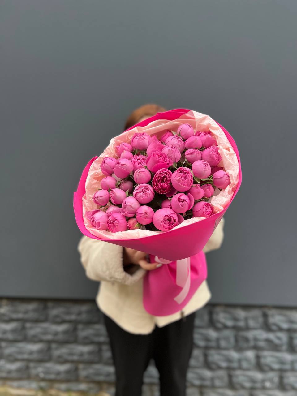 9 пионовидных роз Мисти Бабблс, эвкалипт, зелень, дизайнерская упаковка, лента.