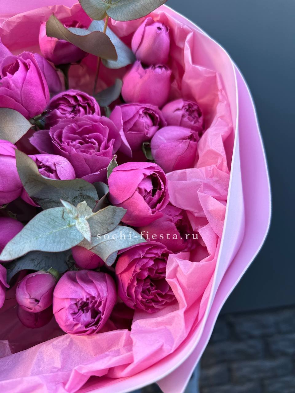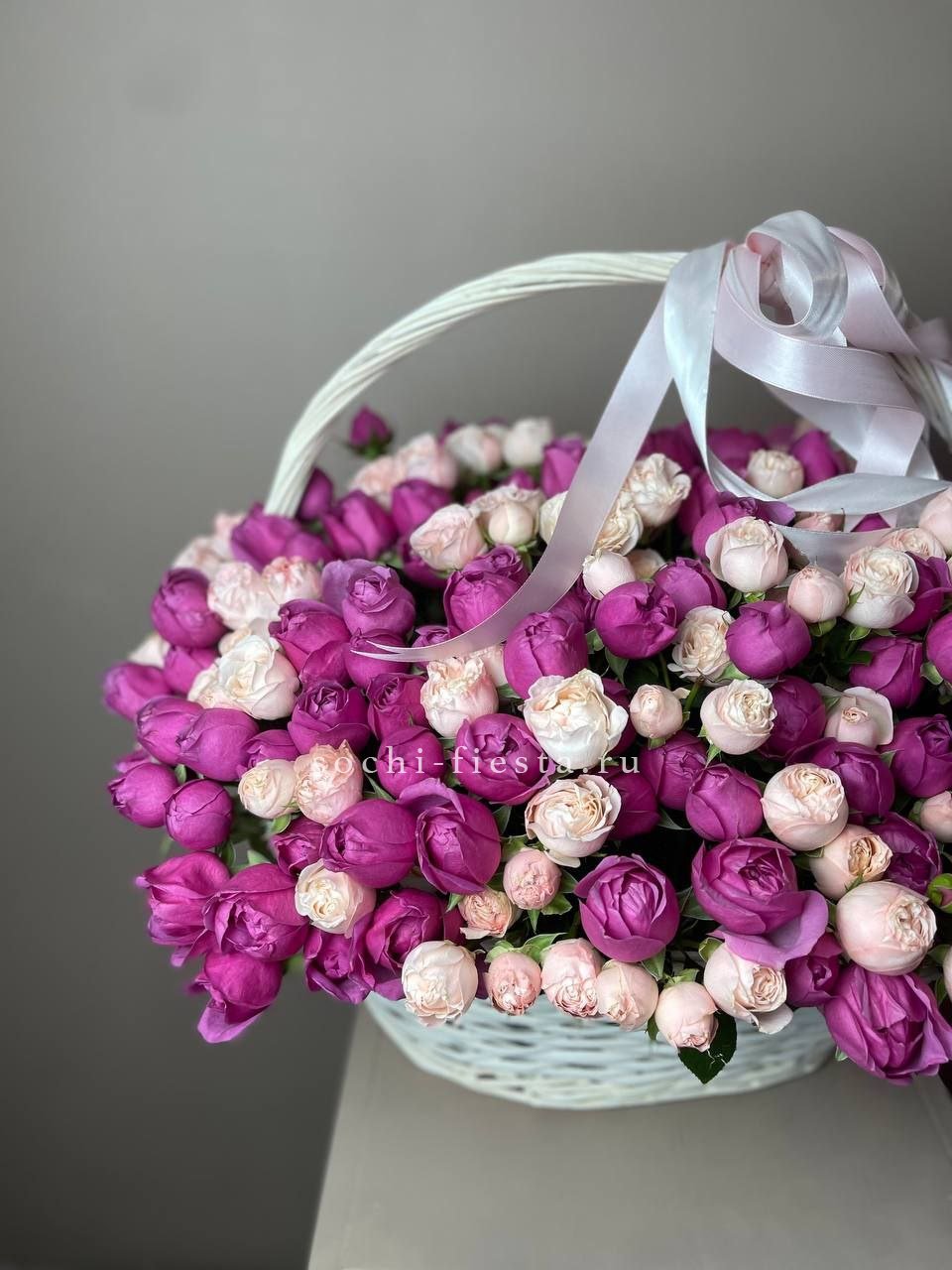 пионовидные кустовые розы Бомбастик и пионовидные кустовые розы Мисти Баблс - 201 шт., лента, светлая корзина D40.