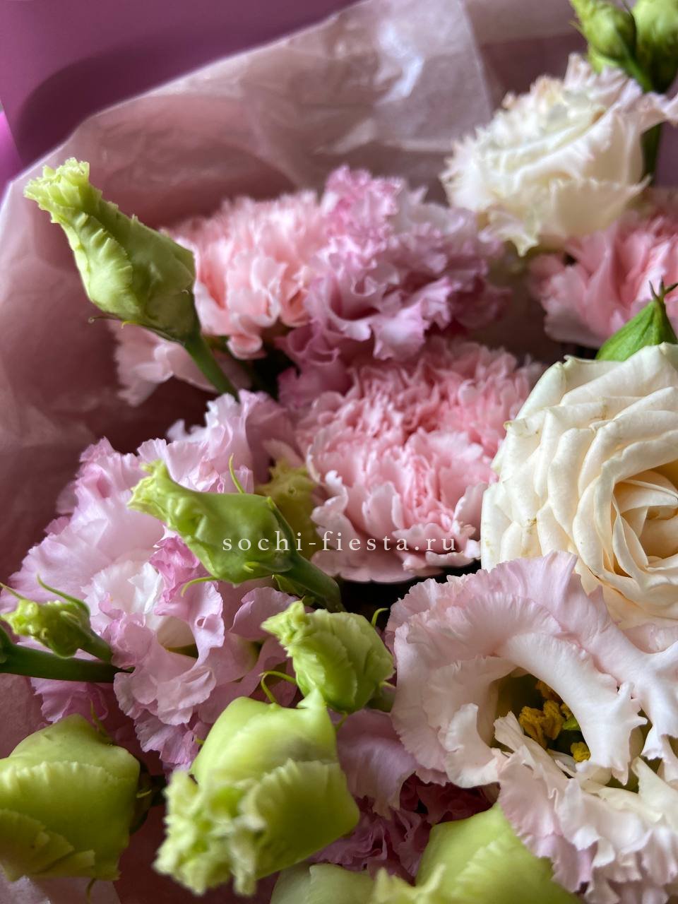 Воздушная композиция в кремовых и белых тонах собрана из нескольких видов цветов с разной формой бутонов. Эустома и диантусы создают мягкую текстуру, а кустовые розы добавляют объём и завершённость силуэту.