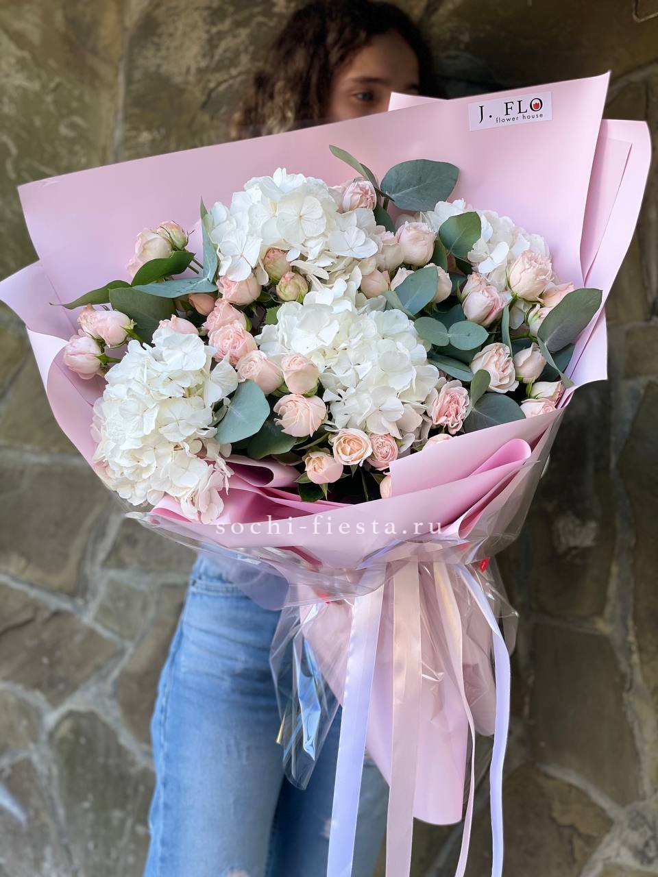 маттиола, розы, гортензия, диантусы, хризантемы , лента и дизайнерская пленка.