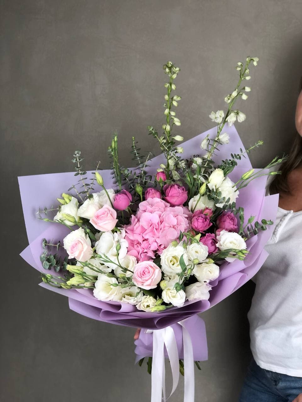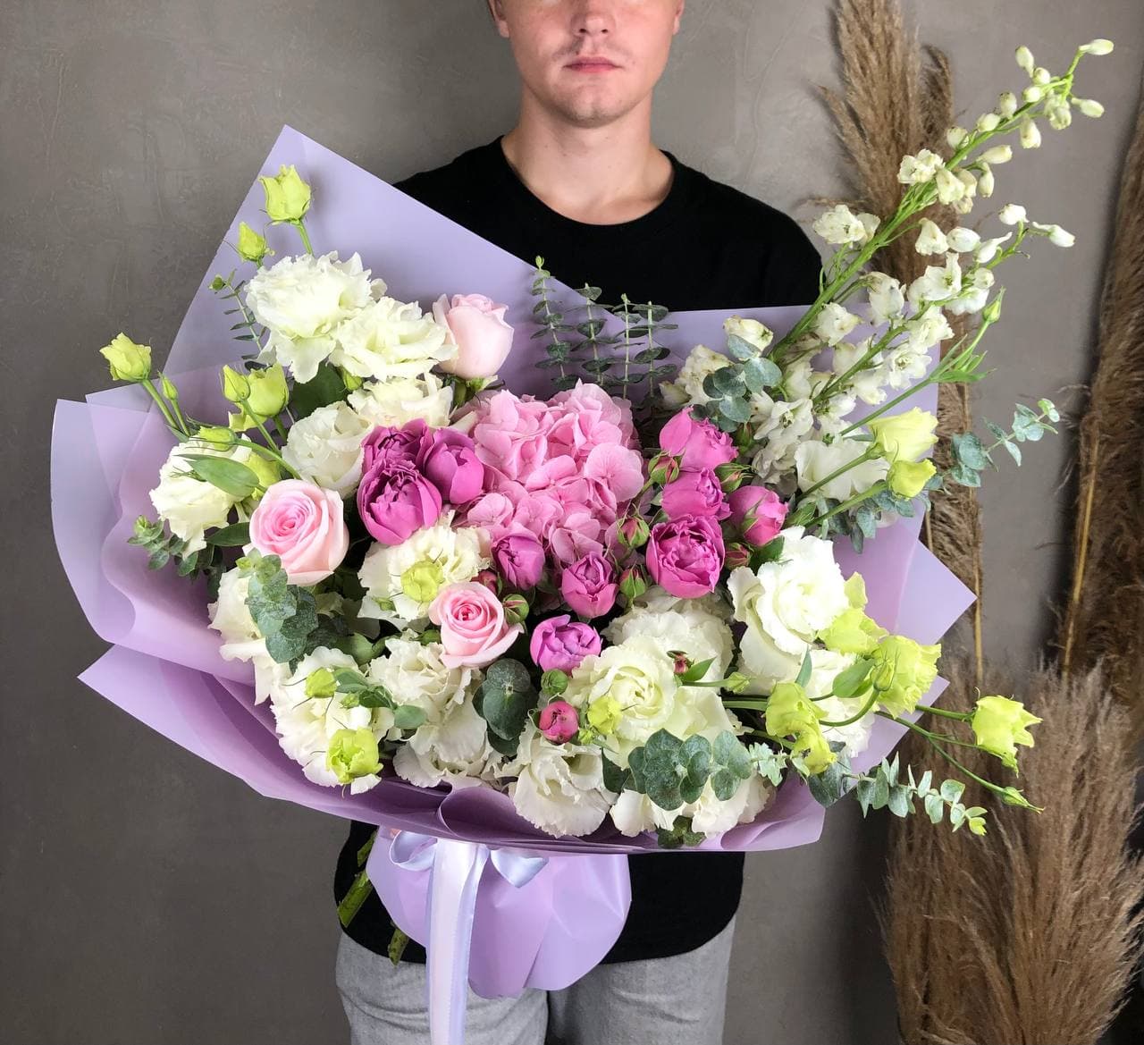 гортензия, роза, эустома, бомбастик,  эвкалипт, лента, дизайнерская пленка.