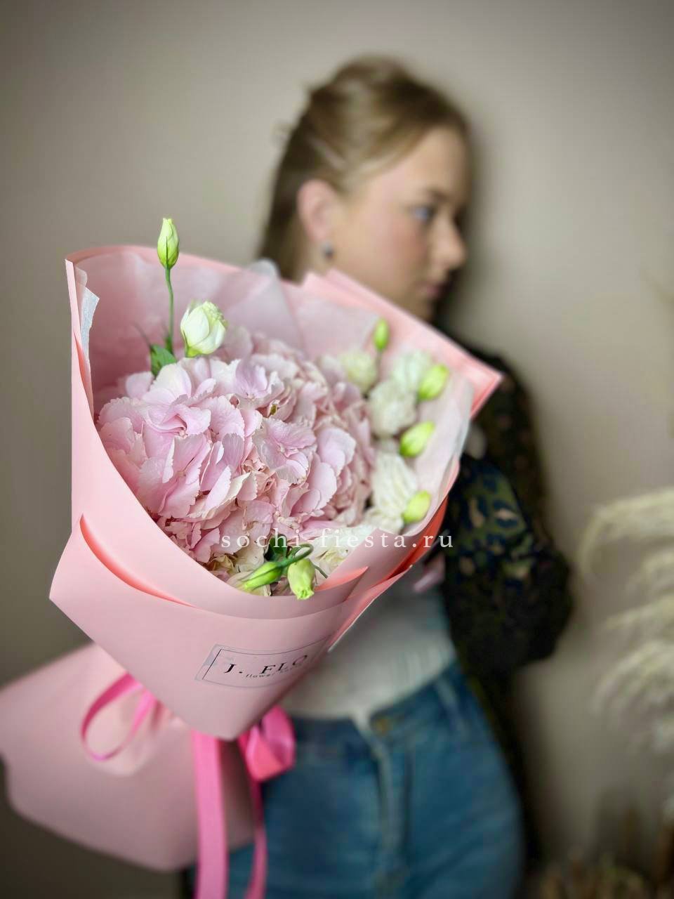 диантусы, эустома, лента, упаковка.