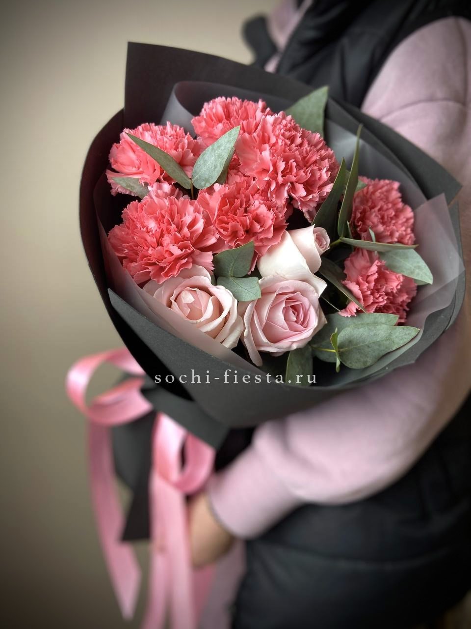 роза, хризантема, кустовая роза, эвкалипт, лента, упаковка.