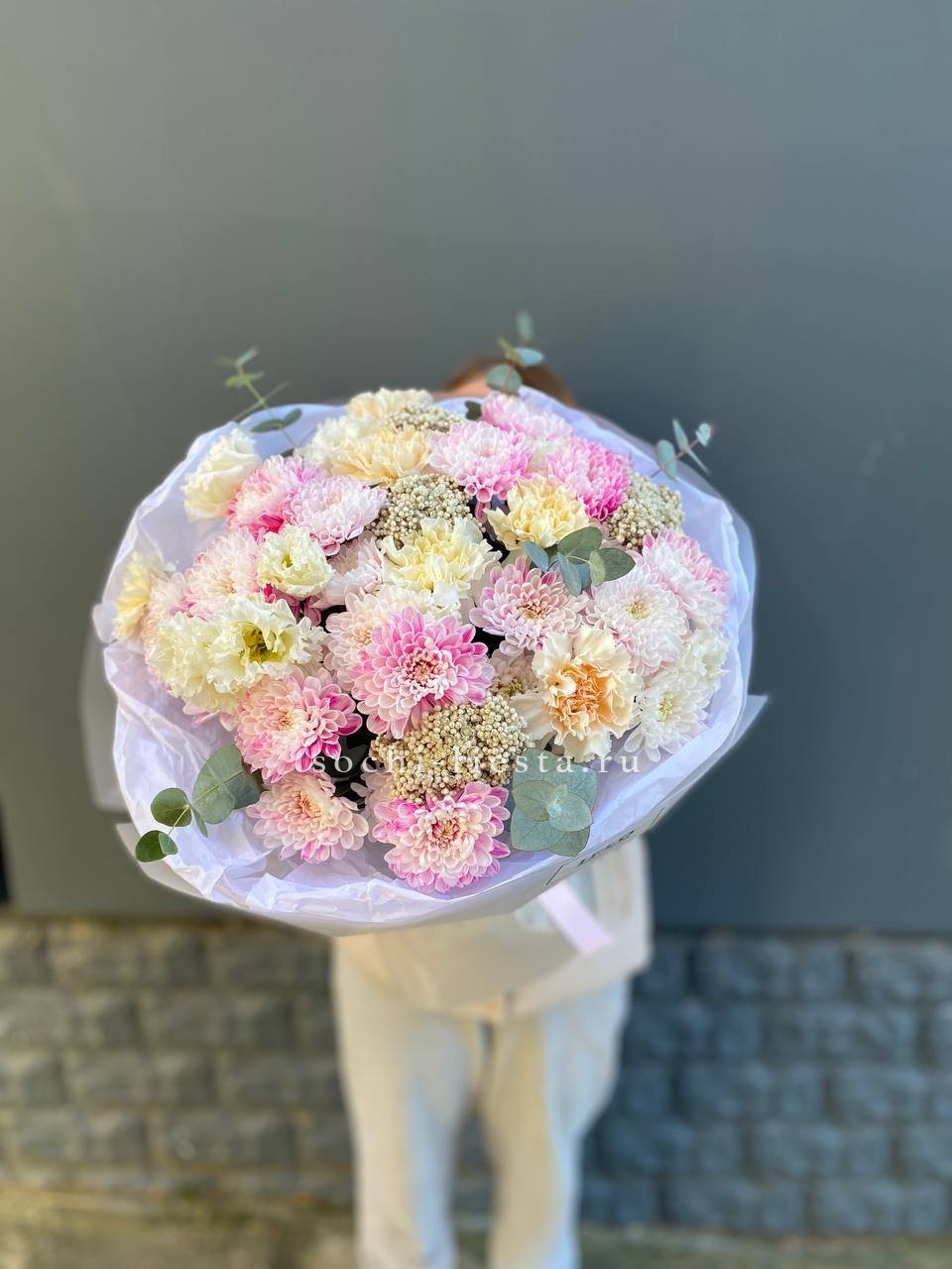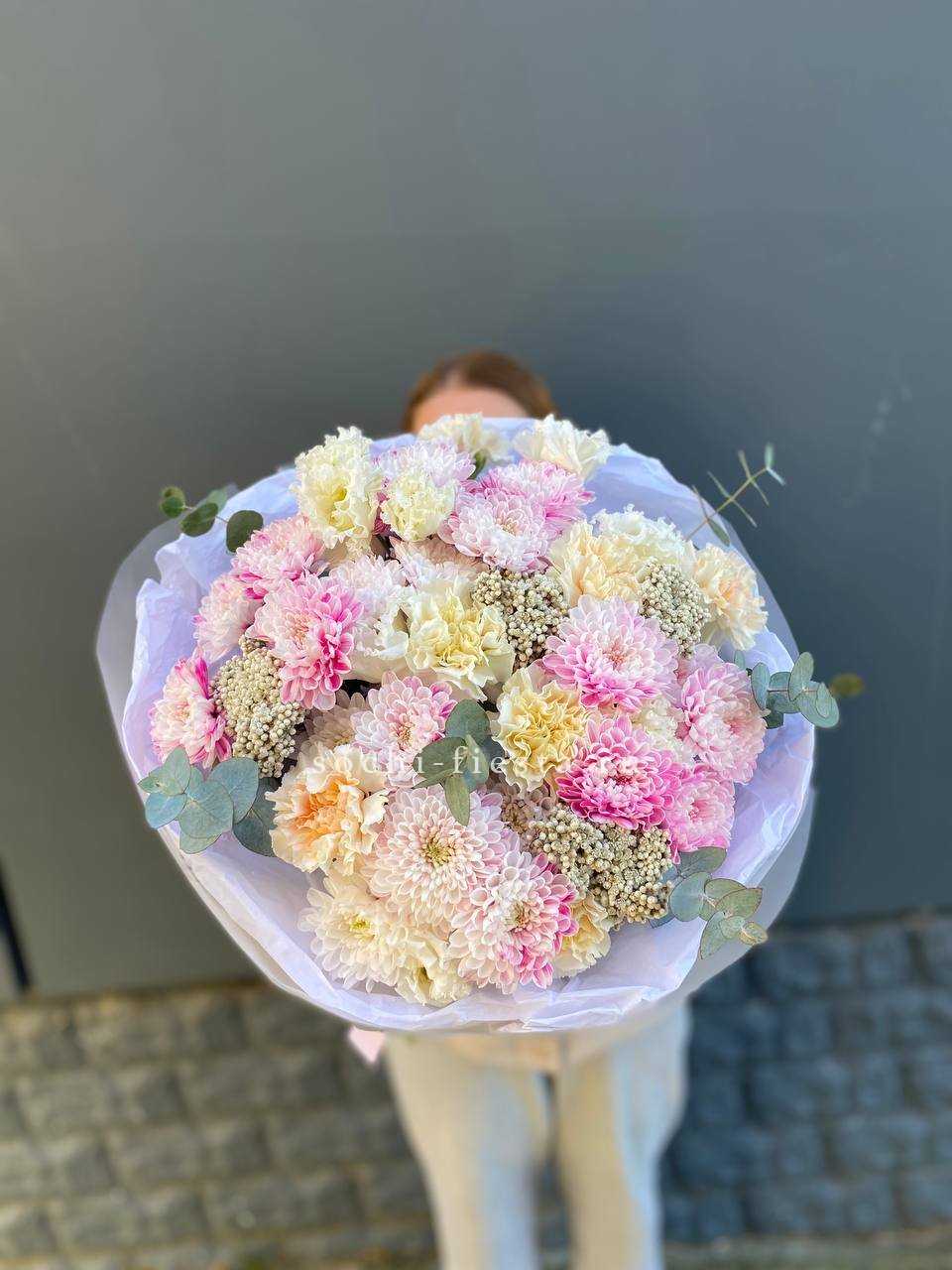 гортензия, диантус, хризантема, эустома, розы, озатамус, пленка.