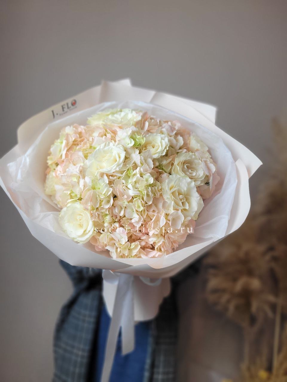 Экзотический лотос встречается с пушистым хлопком и кустовыми розами пионовидной формы. Ковыль добавляет воздушности, а озатамус создает природную текстуру. Композиция для тех, кто ценит необычные сочетания растений.