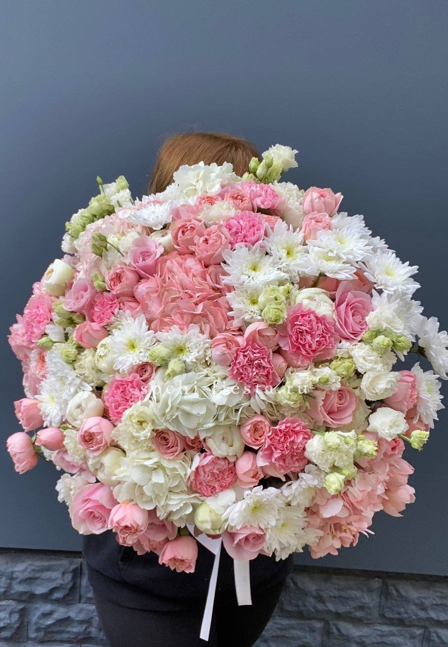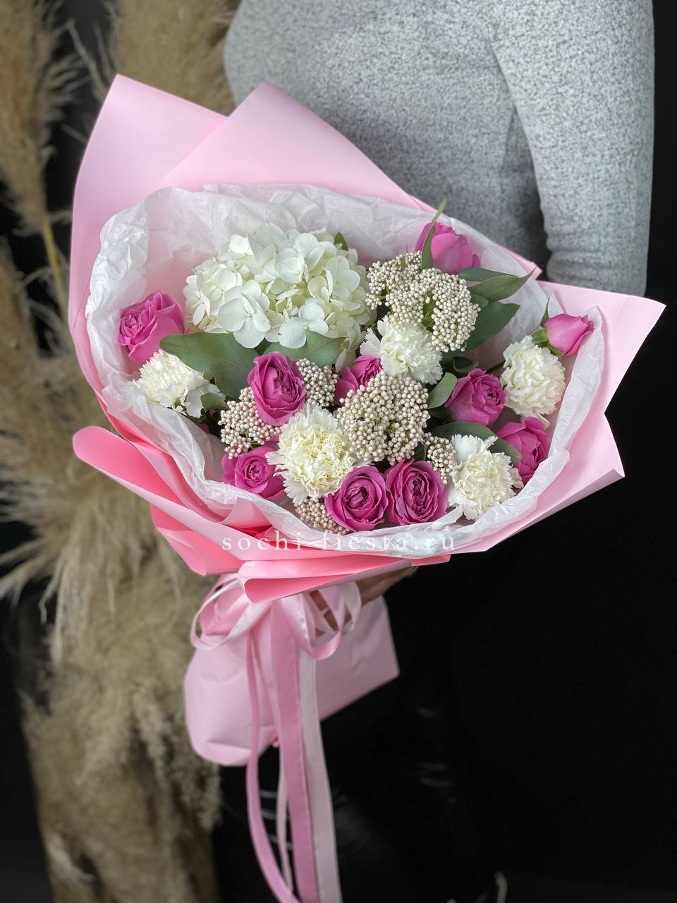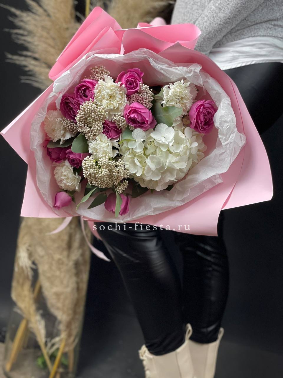 Воздушная композиция с крупными соцветиями гортензии и пышными розами создает ощущение легкости и объема. Эвкалипт добавляет свежести, а бомбастик расставляет яркие акценты между бутонами.