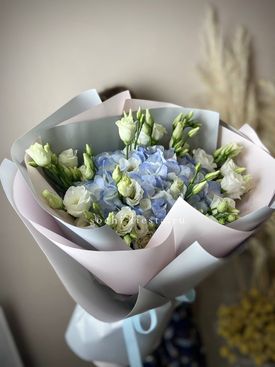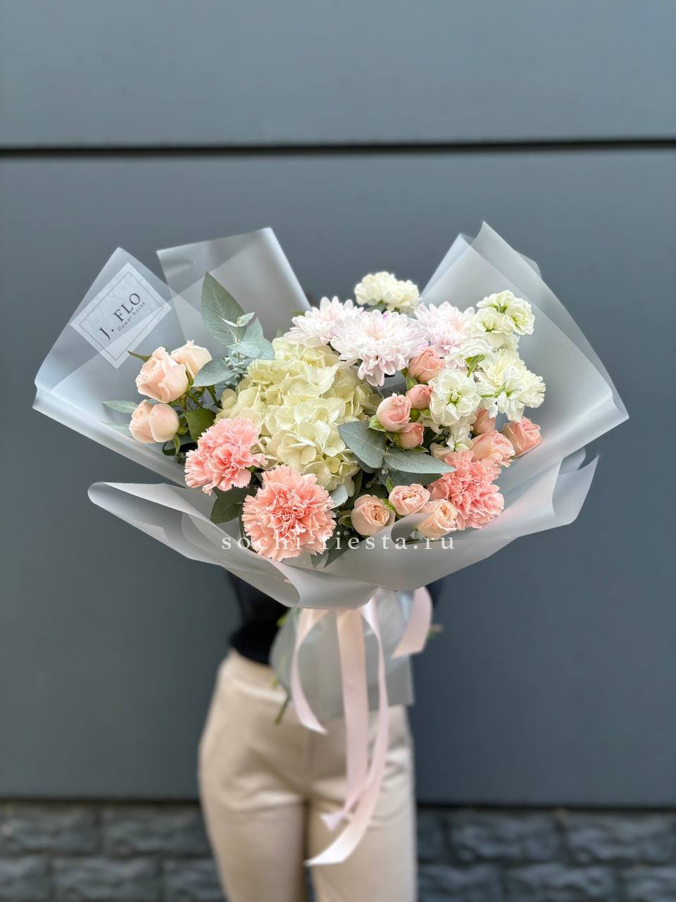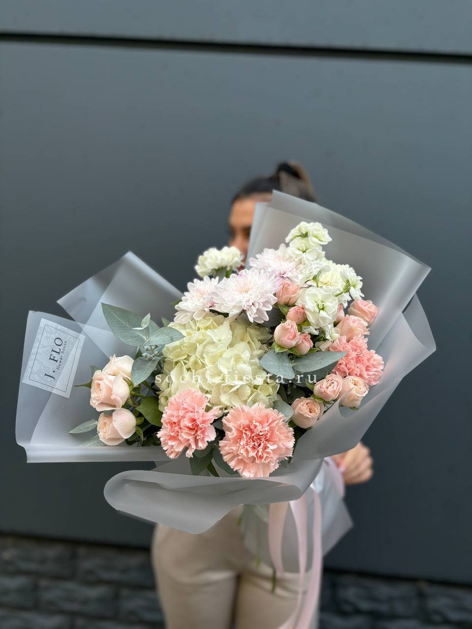 Монохромная палитра с многослойной структурой. Французские розы и эустомы чередуются с кустовыми бутонами, гортензии заполняют объём, а диантусы создают точечные акценты. Букет выглядит цельно и графично.