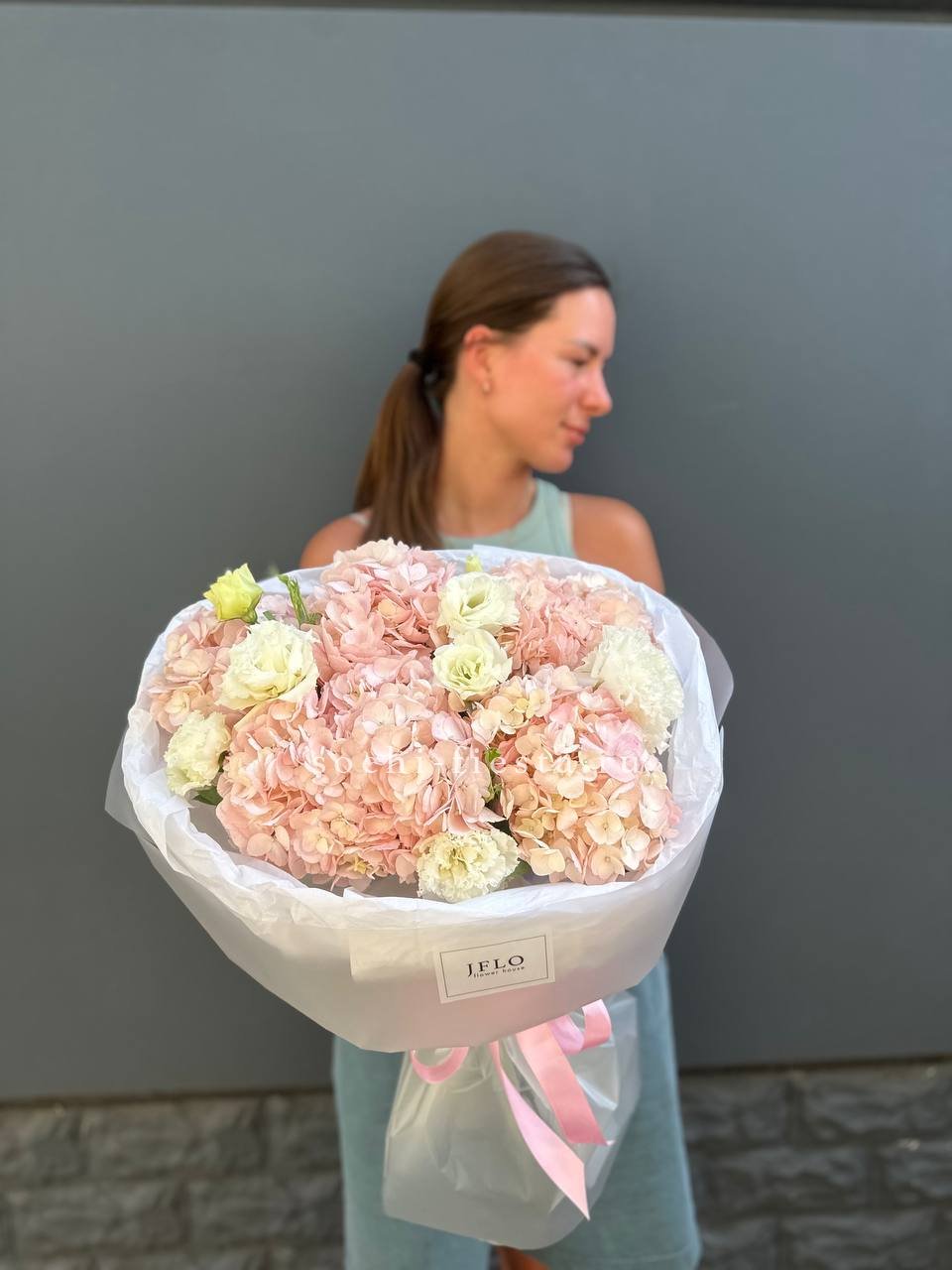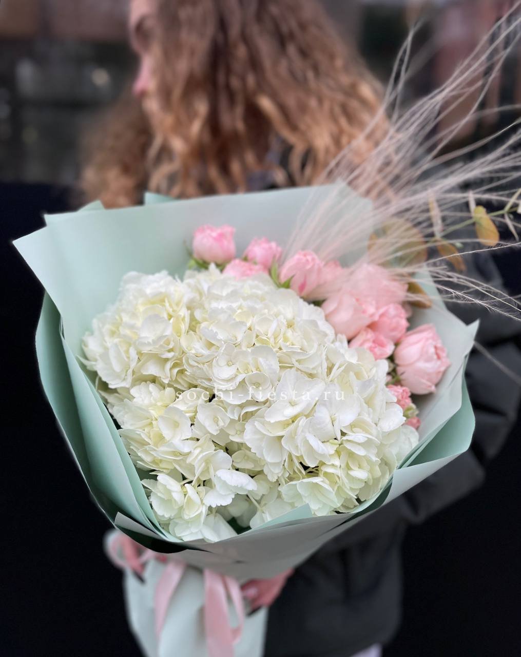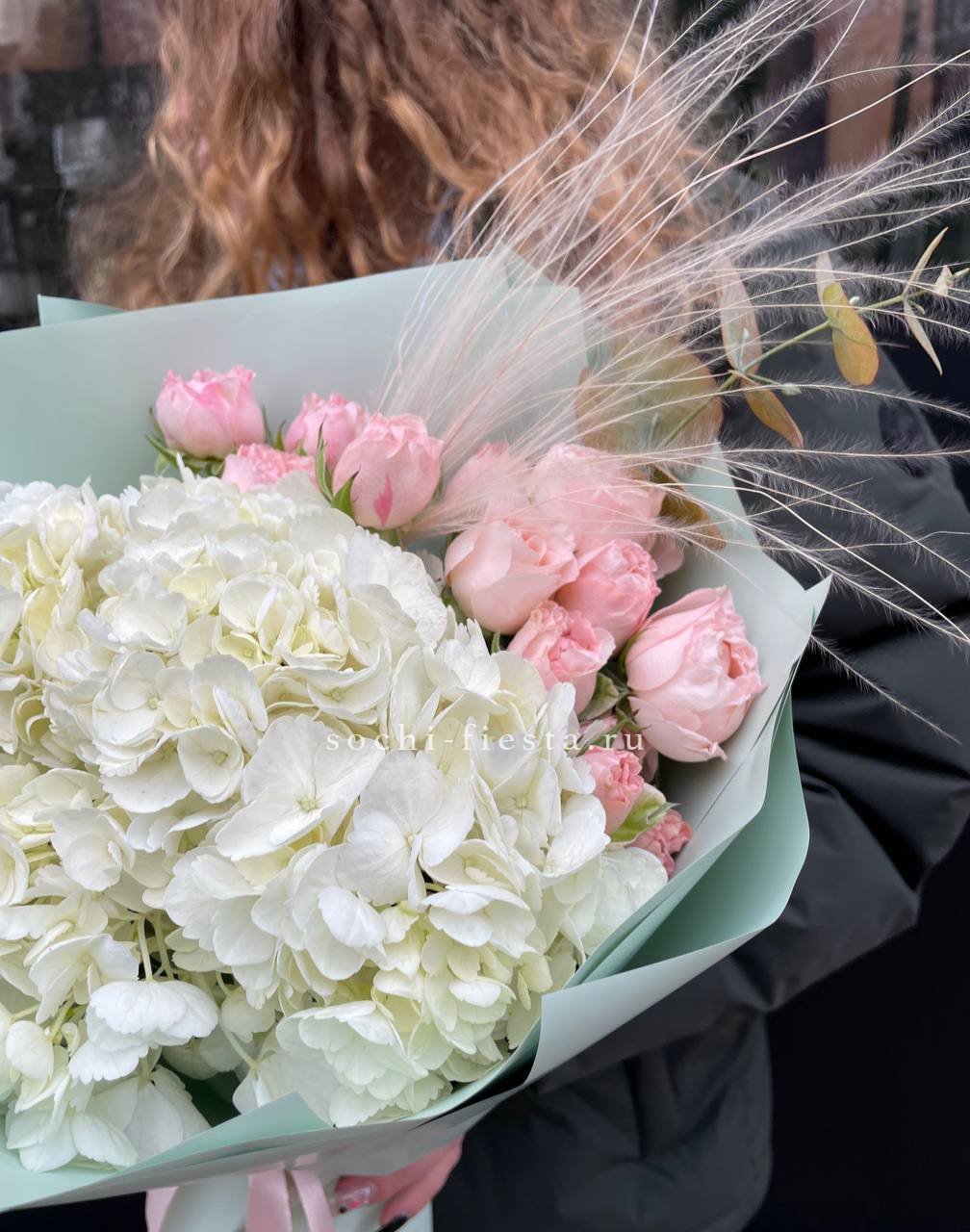 Пушистые соцветия гортензии сливаются с мягким хлопком и формируют объёмное облако. Герберы и диантусы вносят цветовые акценты, а розы завершают романтичную картину.