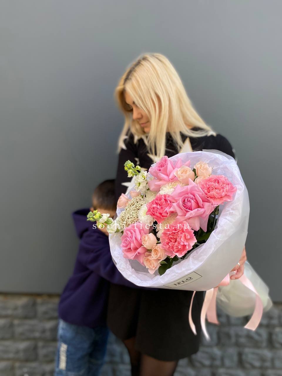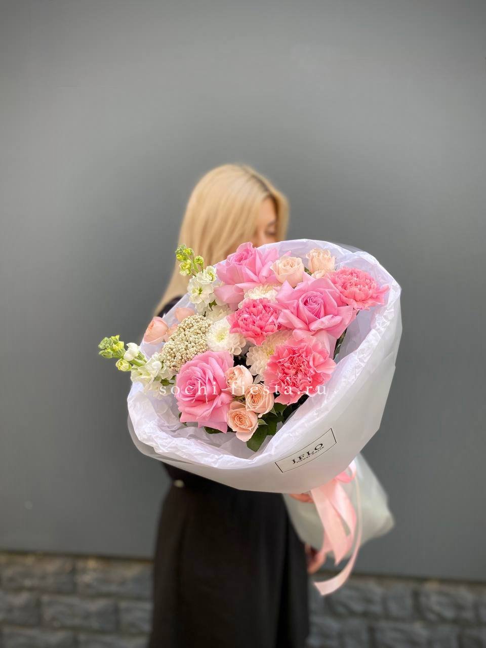 роза кустовая, диантус, лента, дизайнерская упаковка.
