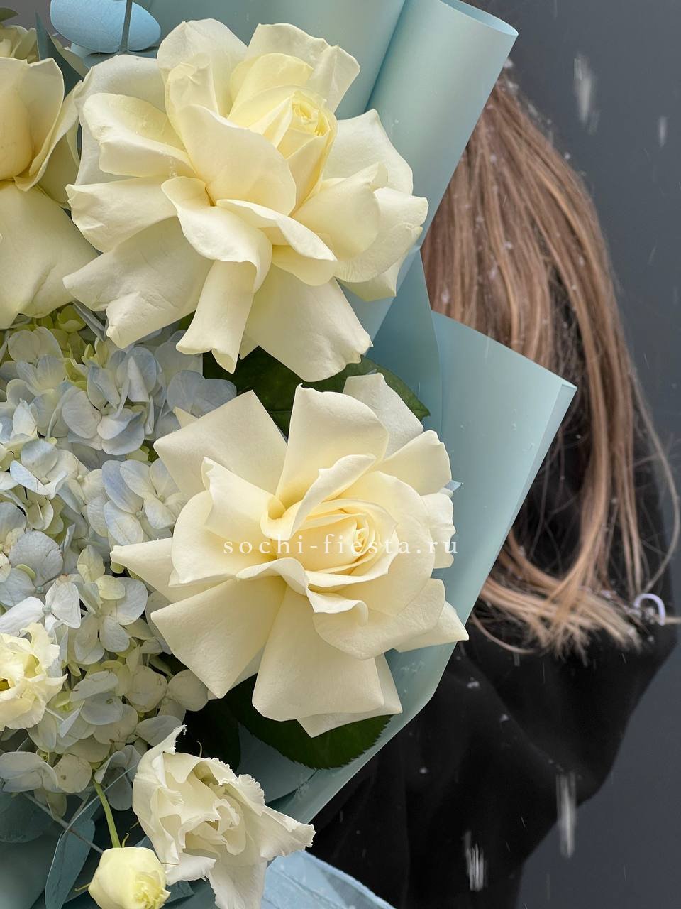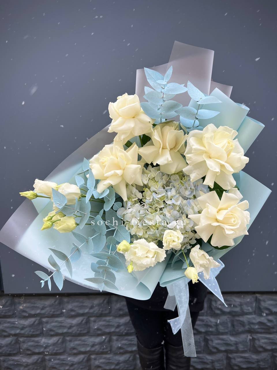 гортензия, роза, кустовая роза, диантус, эустома, дельфиниум, эвкалипт, лента, авторская упаковка.