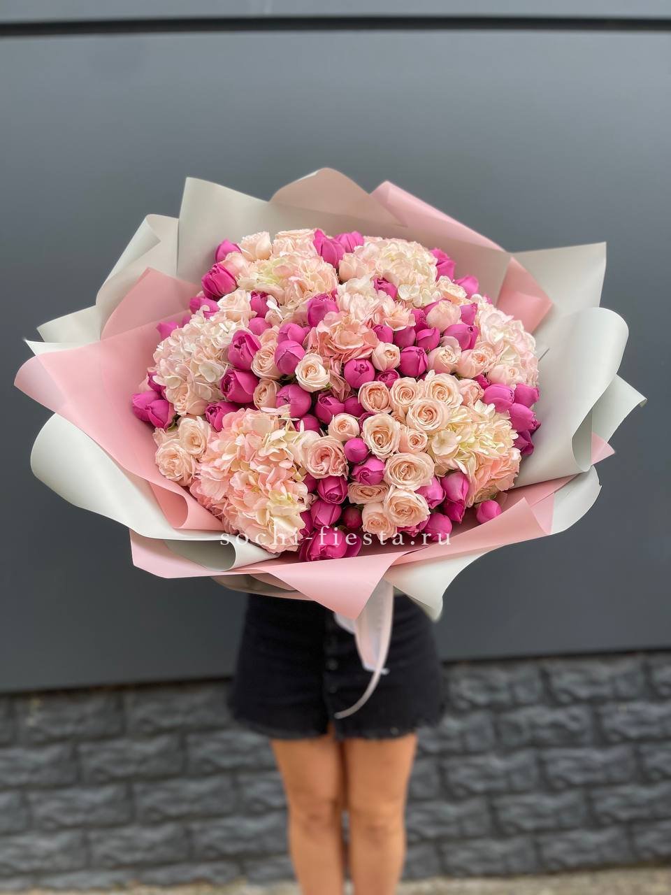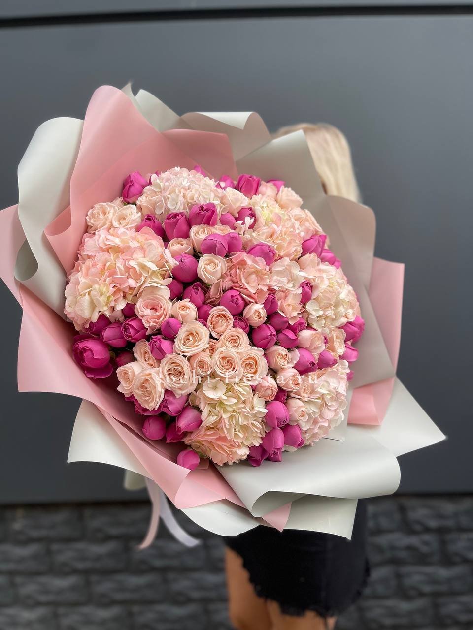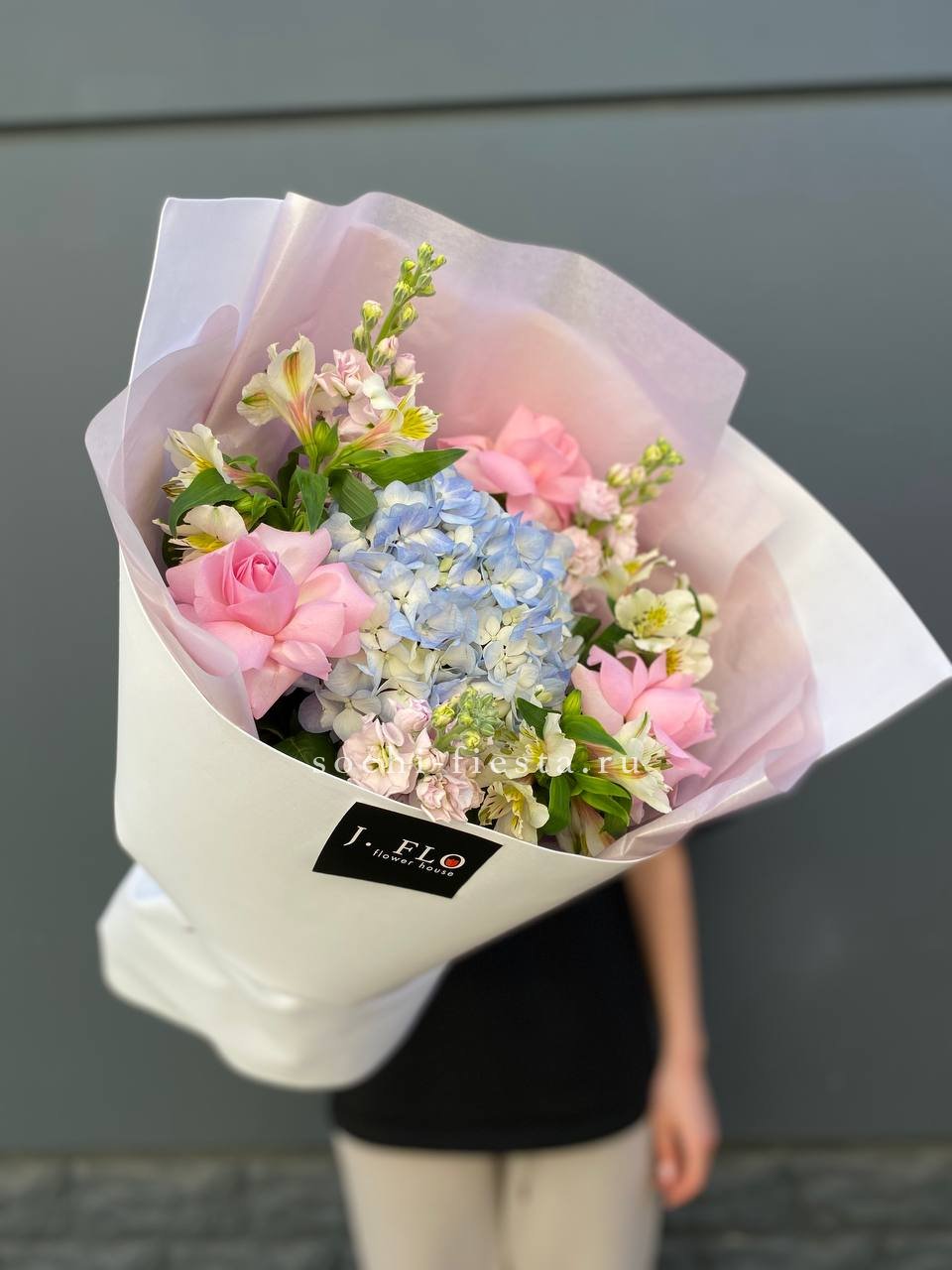 розы, гортензия, альстромерии, маттиола лента и дизайнерская пленка.
