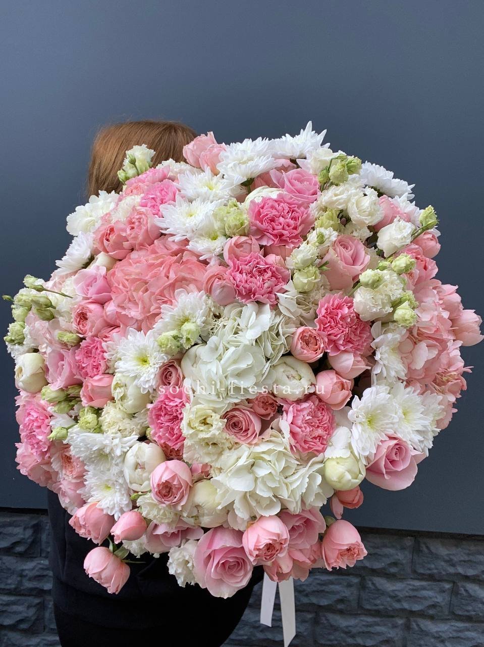Масштабная композиция с пионами, эустомой и розами разворачивается во всей красе. Хризантемы и гортензия создают впечатляющее присутствие, которое преображает пространство вокруг.