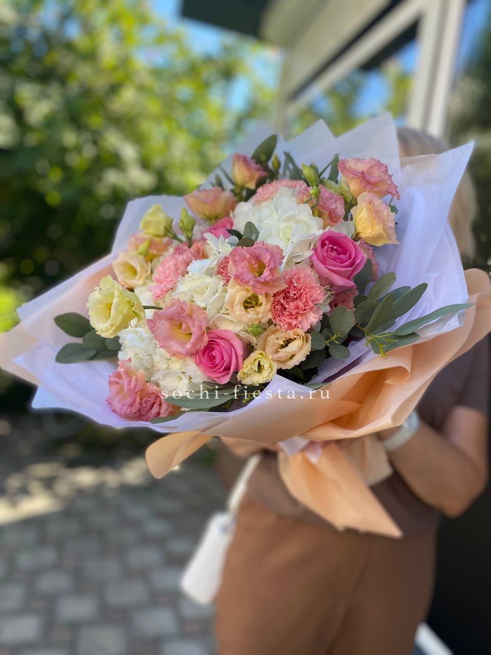 пионы (или аналог вне сезона), лимониум, маттиола, мисти баблс, эустома, эвкалипт, лента, упаковка.