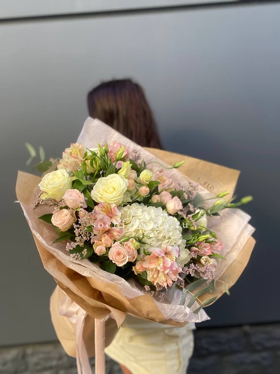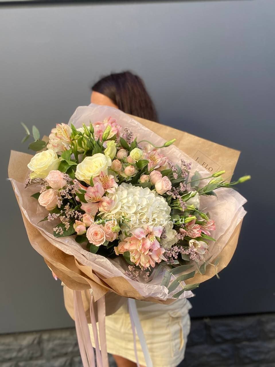 Диантусы и маттиола добавляют букету душистую лёгкость, а гортензия создаёт объёмную основу. Мисти баблс и эвкалипт рисуют воздушный контур вокруг розовых оттенков.