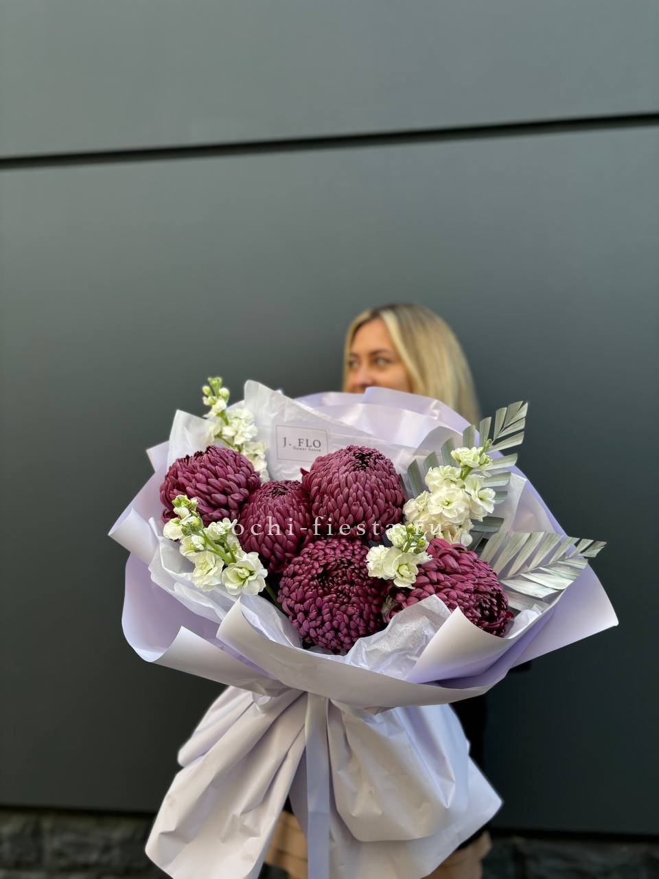 хризантемы Бигуди, маттиола, лист чика (возможна замена на эвкалипт), хризантема кустовая,  эустома, хлопок, лента, дизайнерская упаковка.