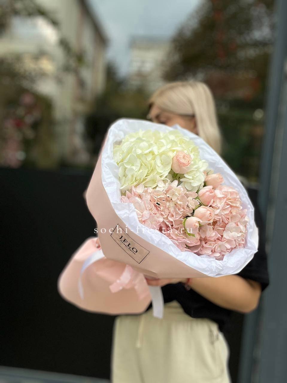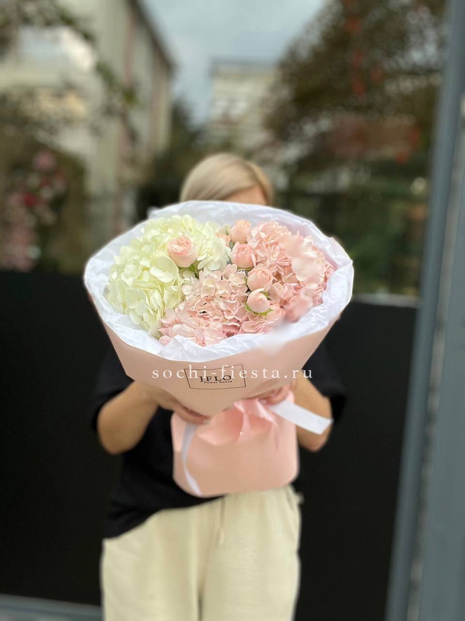 гортензия, розы, диантусы, хризантема, пионы (или пионовидные розы), эустома, корзина. Состав может меняться, в зависимости от сезона.