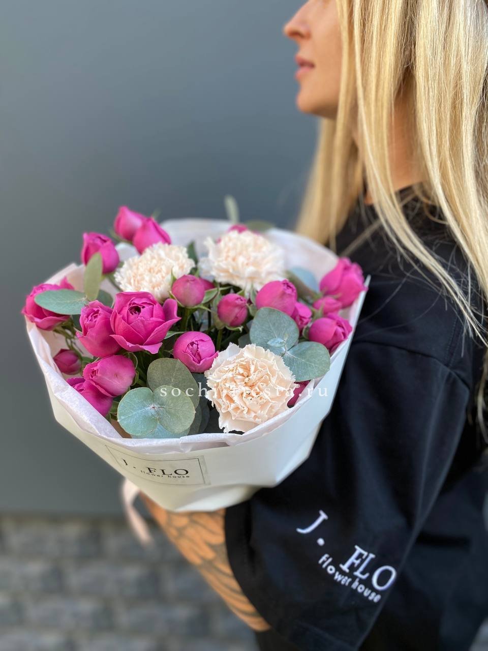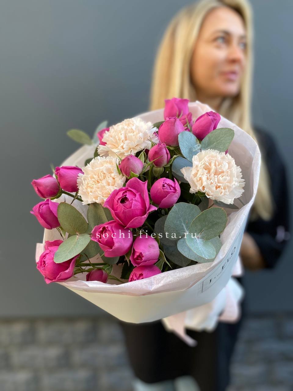 Крупные головки роз раскрываются широко, создавая объёмную фактуру с глубиной. Диантусы заполняют пространство между бутонами, формируя плотную структуру. Букет занимает много места и сразу привлекает внимание.