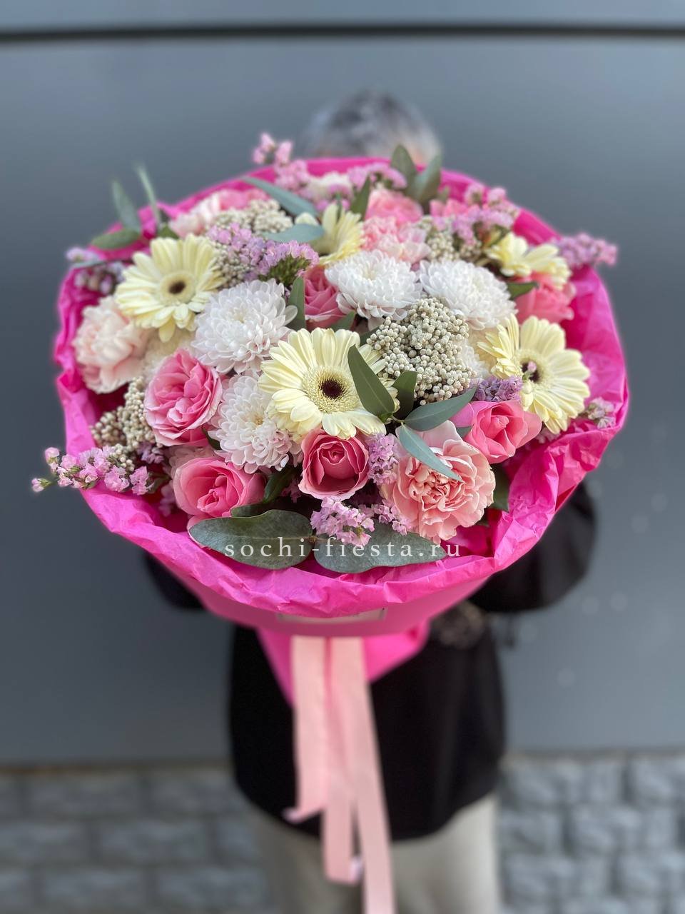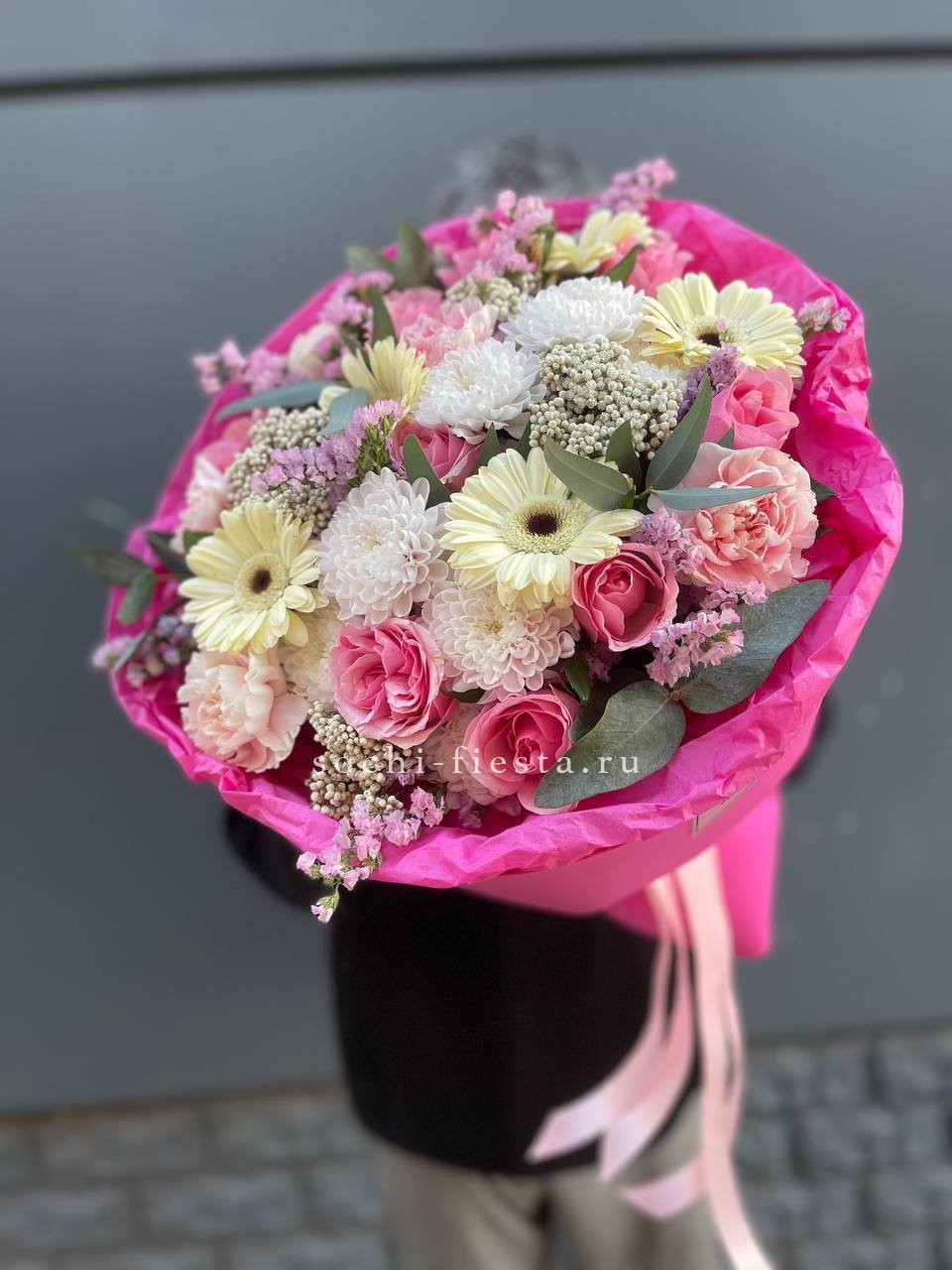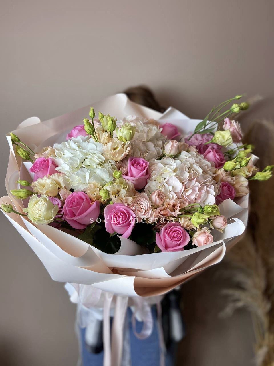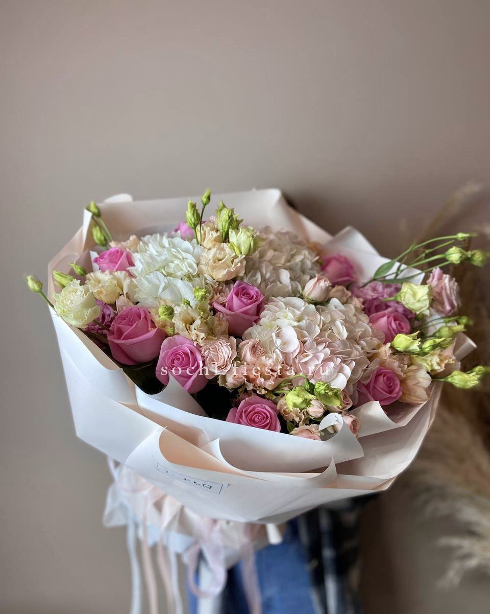 Букет объединяет хризантемы, диантусы, розы, эустому и гортензию в плотную композицию. Корейская пленка удерживает форму и создает графичный силуэт с четкими границами.