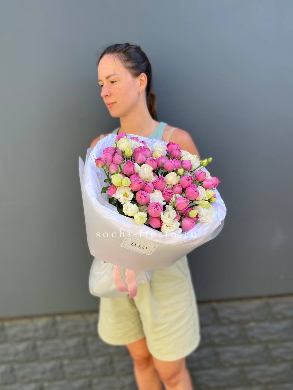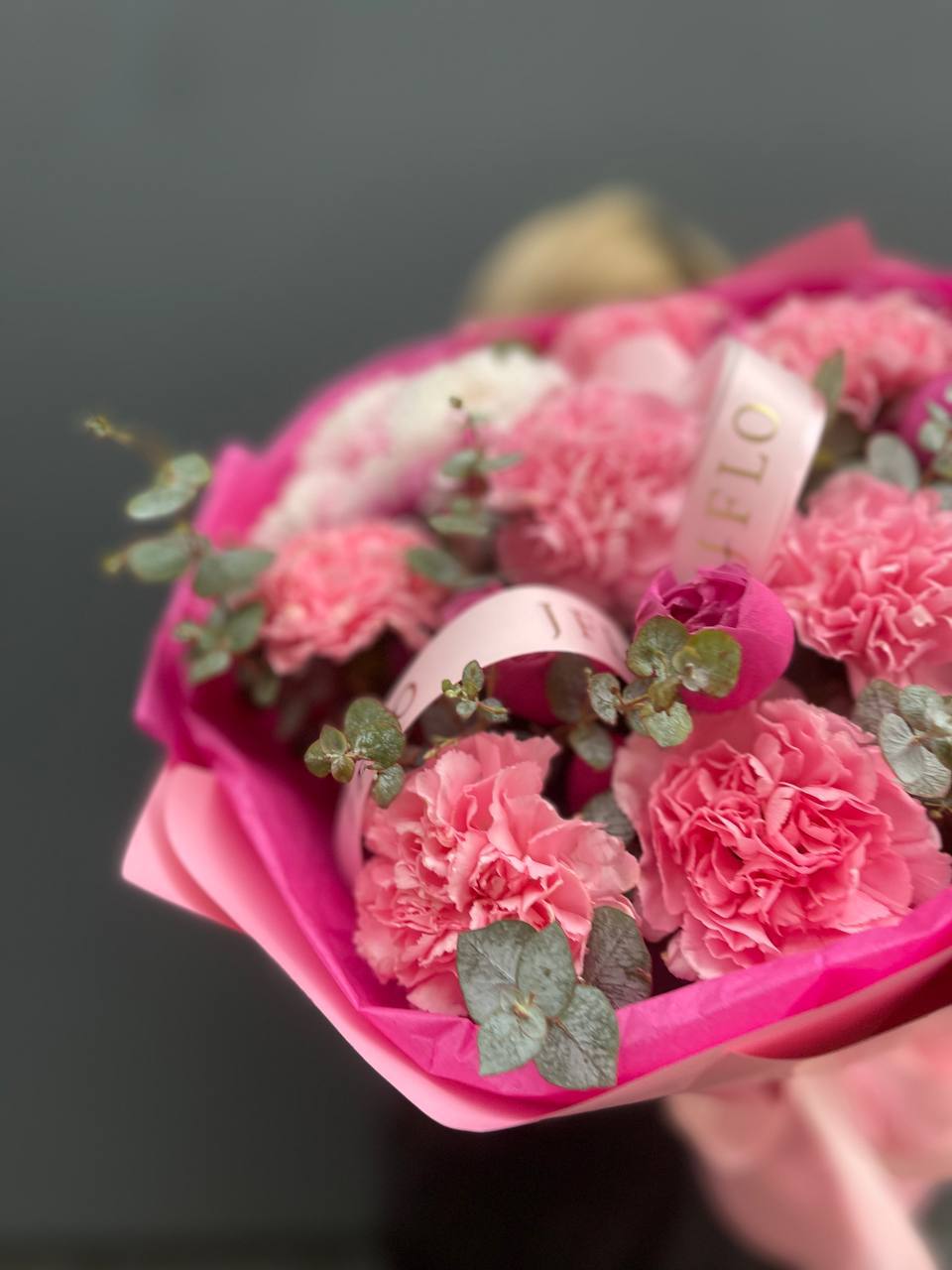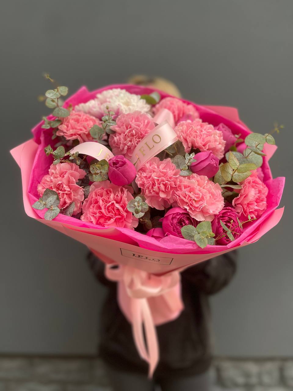 Тюльпаны и диантусы собраны в лёгкую композицию с открытой структурой. Букет дышит и держит форму благодаря продуманному ритму расположения бутонов.
